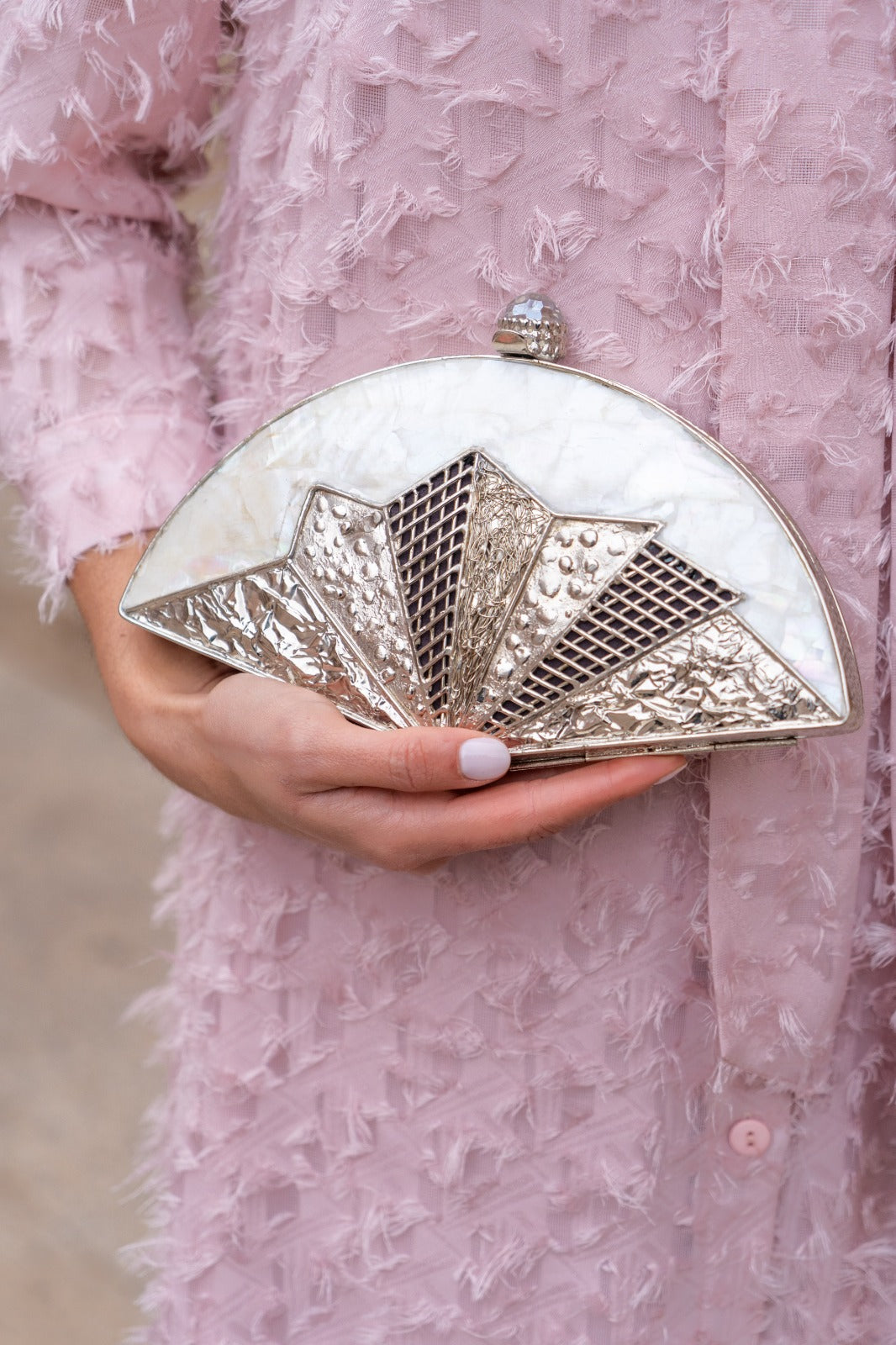 Con forma de bombonera y un diseño cuidadosamente trabajado a mano, en latón plata y nacar, detalle pomo con cristal.