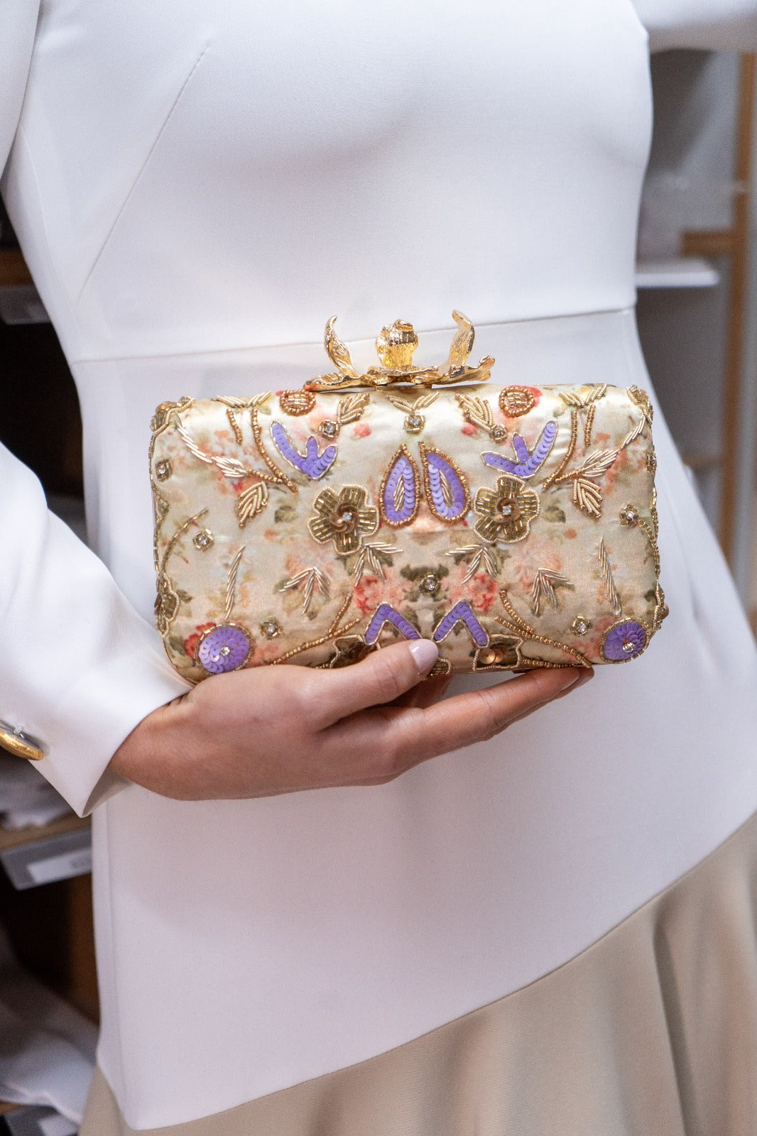 Bolso ovalado, con pomo dorado, cadena larga para colgar. Con estampados y pedrería palmeras en varios colores.