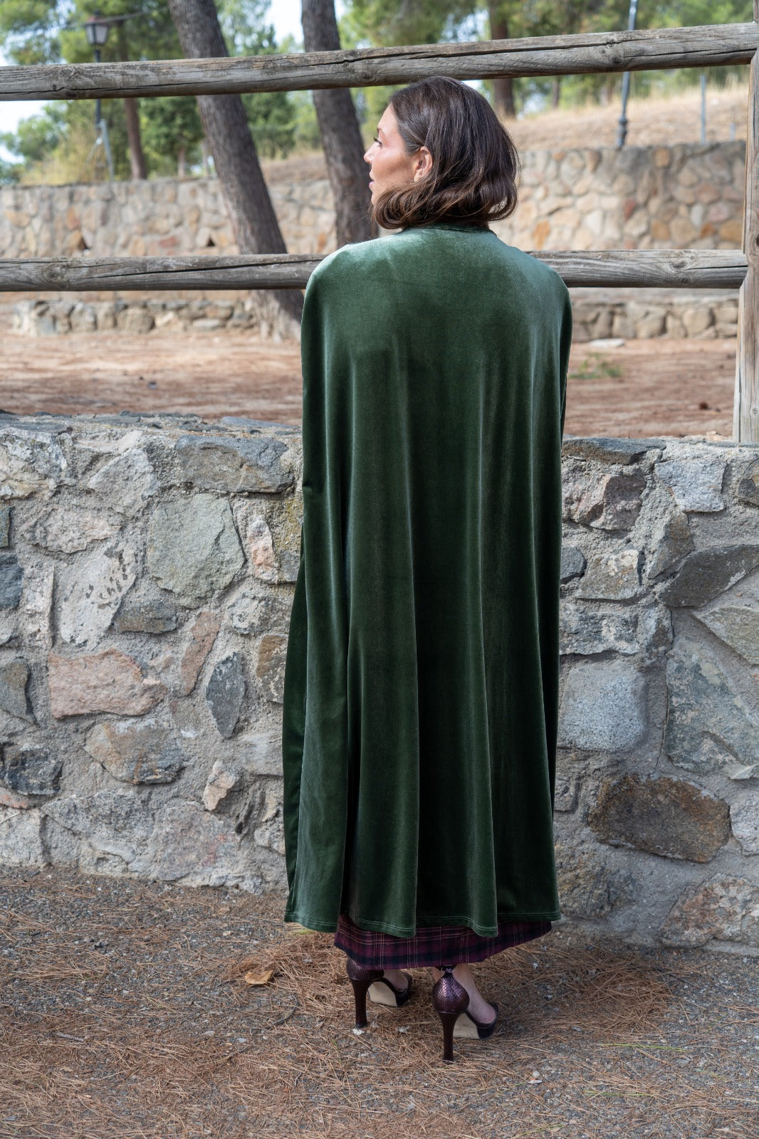 Capa en terciopelo, abertura para meter las manos, 120cm aprox de largo, con lazo para anudar al cuello. En color verde.