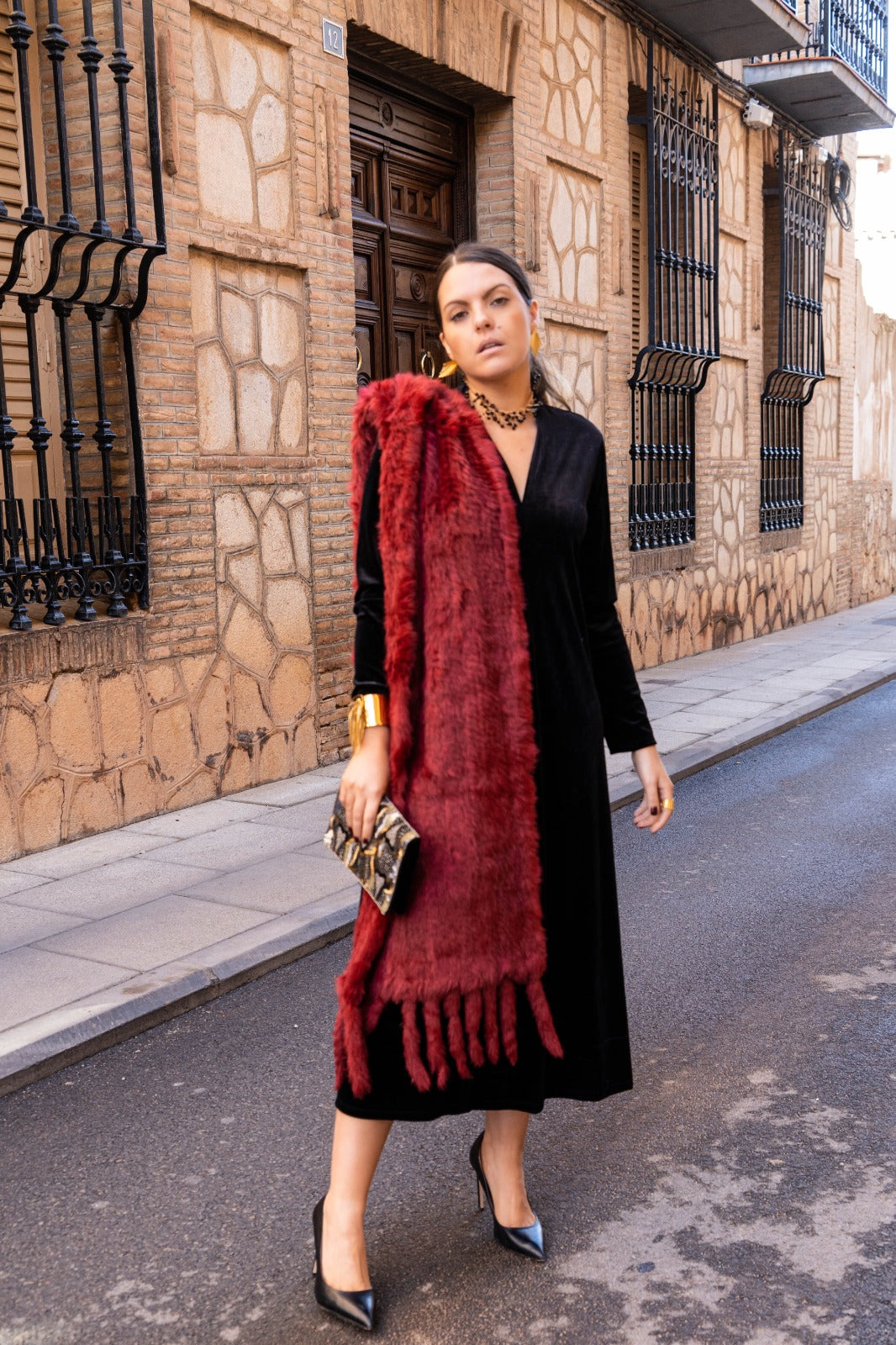 Estola en piel, con flecos en las terminaciones, multicolor en tonos burdeos. Medidas 165x40cm