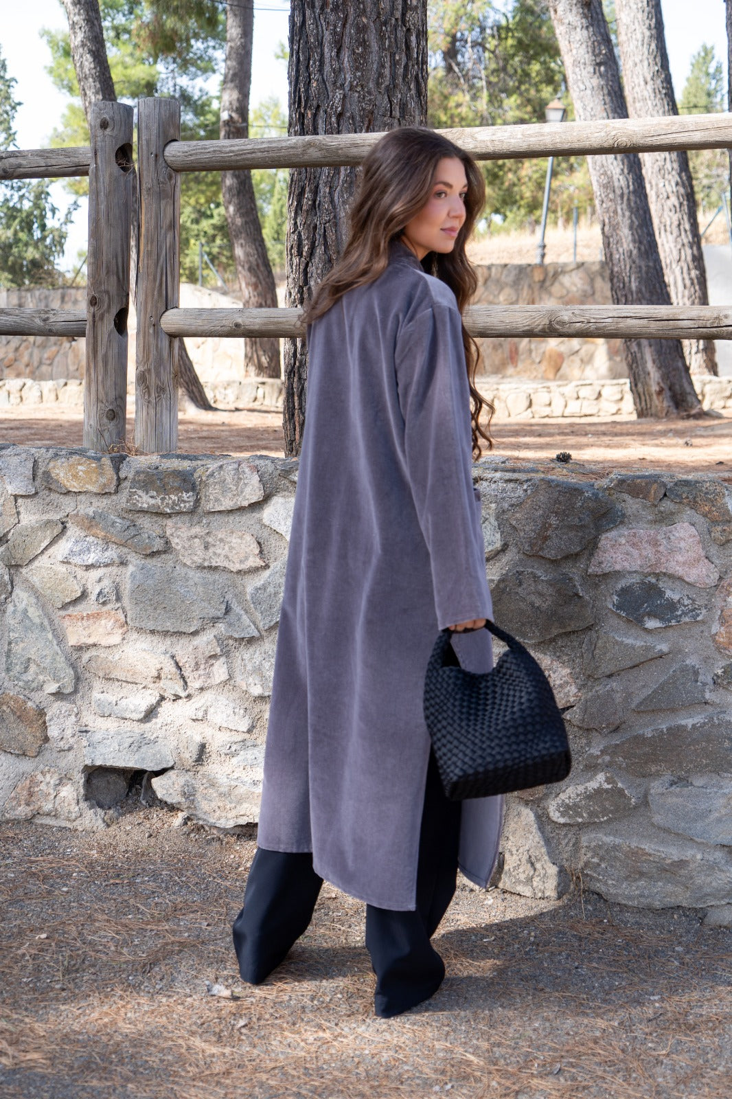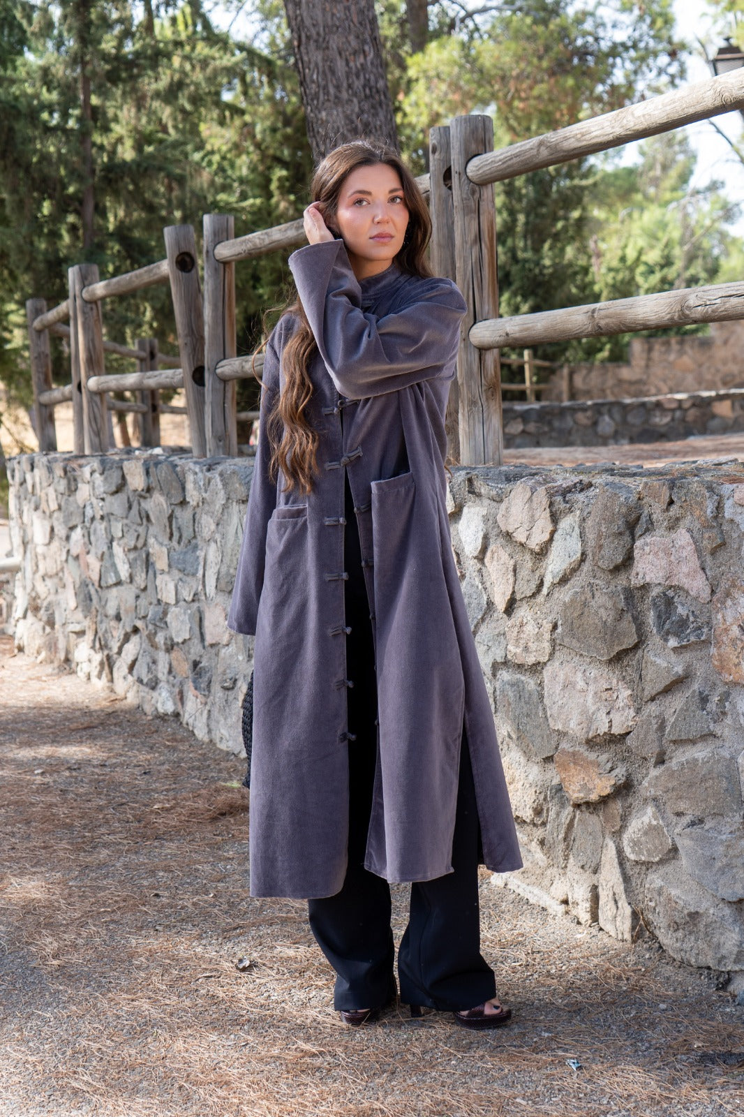 Kaftan recto, aberturas a los lados, manga larga, bolsillos delanteros. En terciopelo color gris.