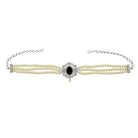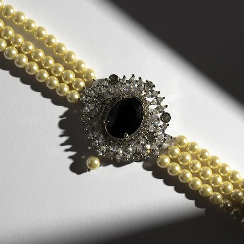 Choker compuesto por tres hileras de piedras, que abrazan delicadamente el cuello. En el centro, una pieza ovalada negra.