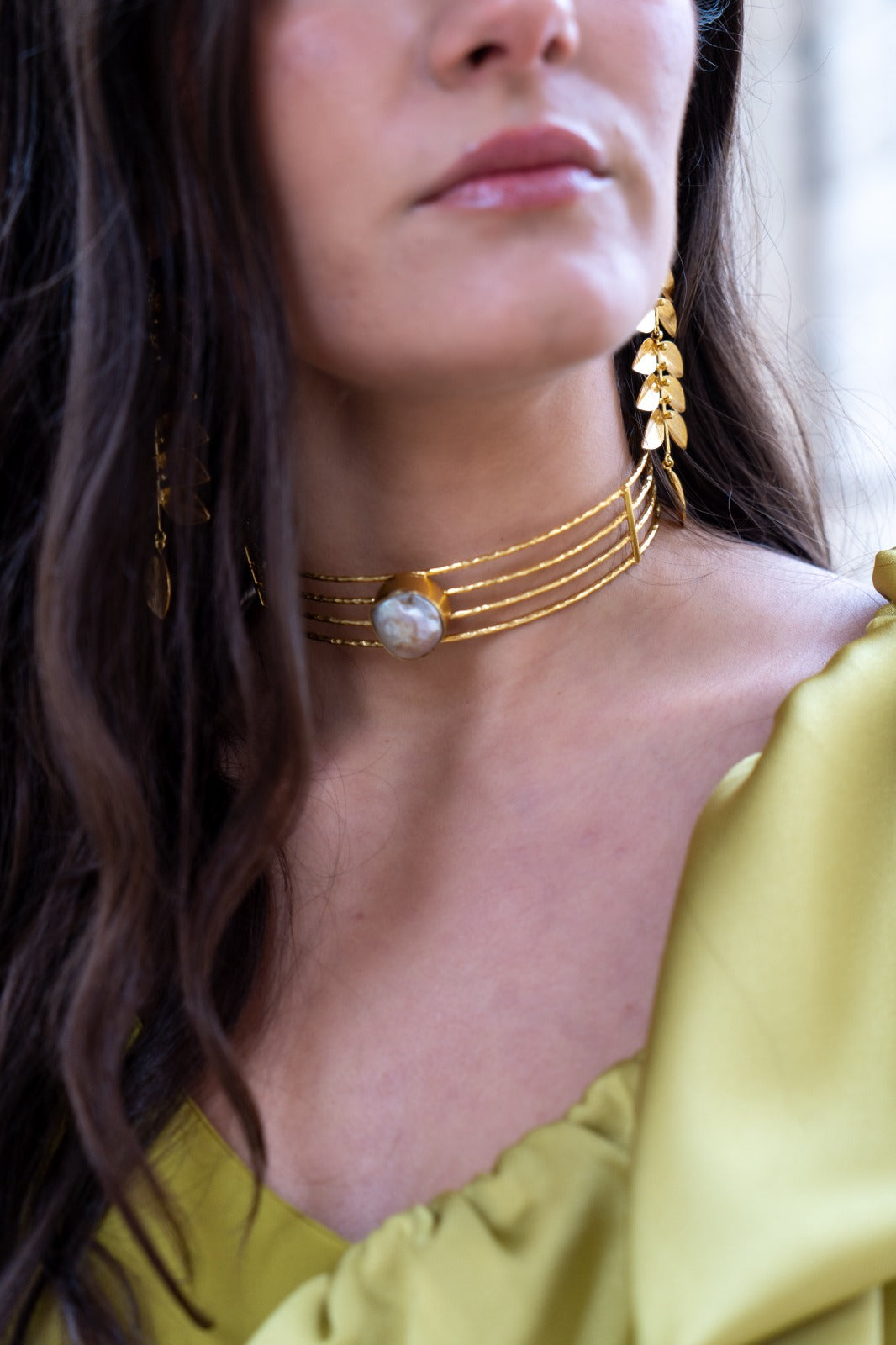 Choker estático formado por líneas doradas que confluyen en una piedra central. Es un modelo grande y muy vistoso que no dejará indiferente a nadie y te aportara mucha luminosidad al rostro.