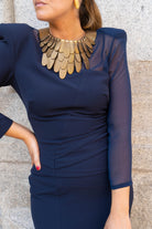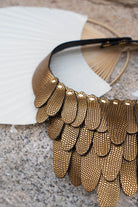 Colgante en piel, formado por varias piezas de una piel metalizada grabada. En color dorado.