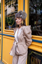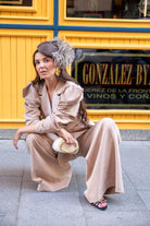 Conjunto compuesto por chaqueta con solapa, cruzada con cinturón, manga abullonada y pantalón tiro alto ancho. En color beige.