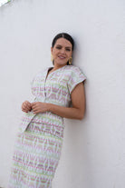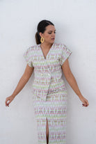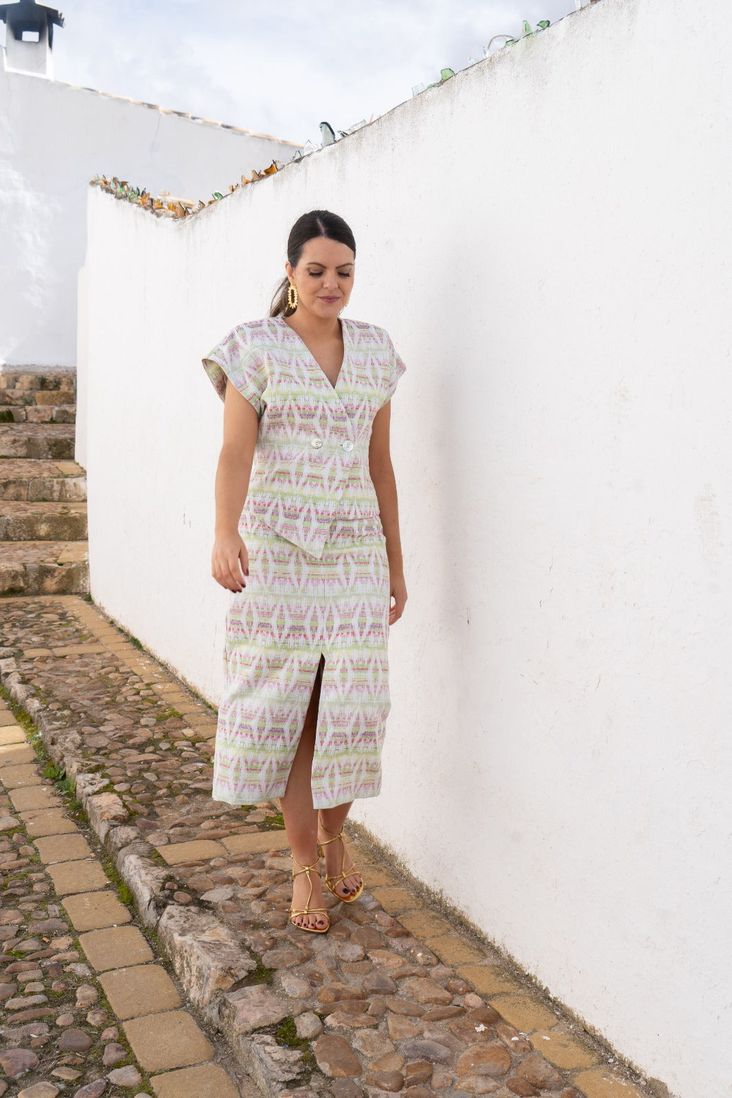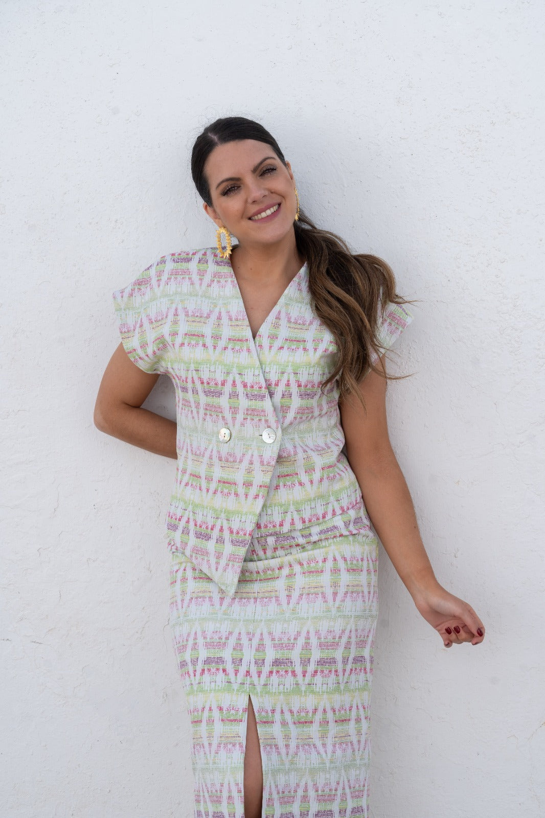 Conjunto compuesto por top de manga corta con hombreras, escote en pico cruzado, abrochado con un par de botones de nácar en la cintura, pequeño peplum y falda de corte recto y midi, con una abertura central. Estampado geometrico en tonos verde.