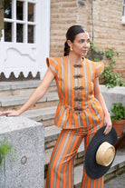 Conjunto compuesto por chaqueta sin mangas con estructura en los hombros y cierre frontal con botones y peplum. Pantalon pierna recta con un ajuste favorecedor y detalles de franjas horizontales en el bajo. Estampado a rayas naranja y tierra.
