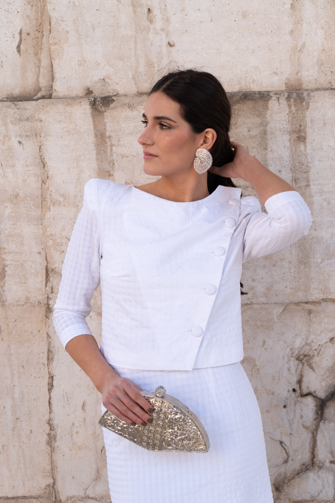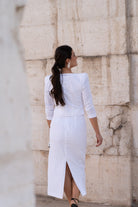 Conjunto compuesto por blusa, escote redondo, cruzada y abotonada, falda alta con abertura trasera. En color blanco.