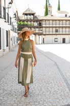 Conjunto compuesto por top cuello redondo, escote trasero anudado a la espalda y falda alta, corte evase. Bicolor verde y beige.