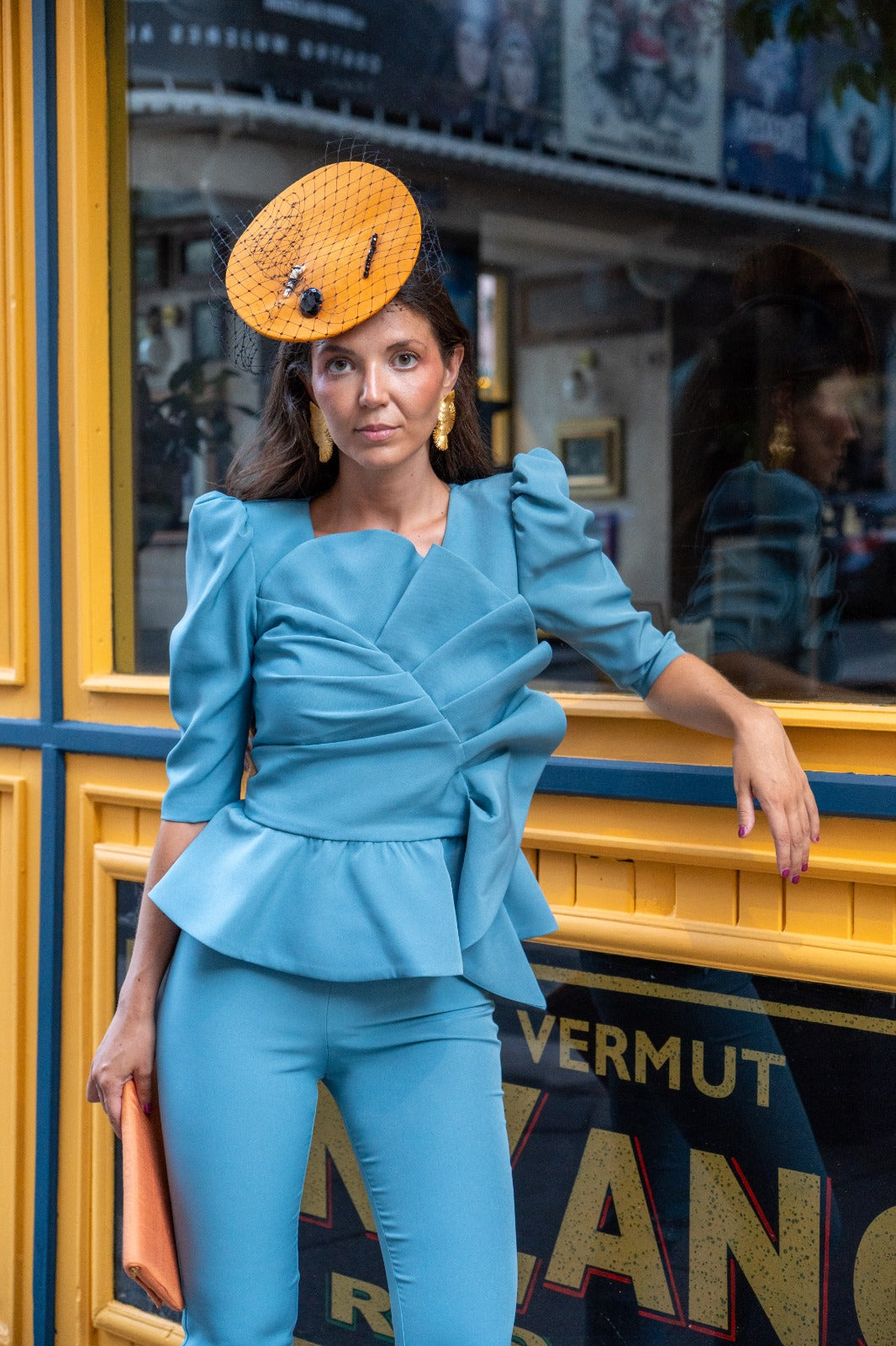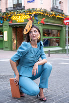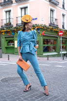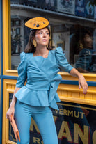 Conjunto compuesto por top escote redondo, manga francesa, lazo delantero, volante abajo y pantalon cintura alta, estrecho, cremallera trasera. En color azul.