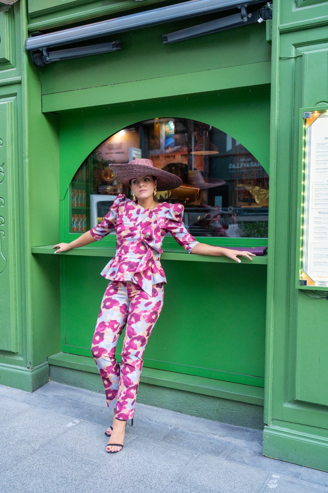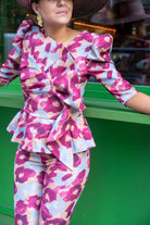 Conjunto compuesto por top escote redondo, manga francesa, lazo delantero, volante abajo y pantalon cintura alta, estrecho, cremallera trasera top y pantalon. En color estampado.