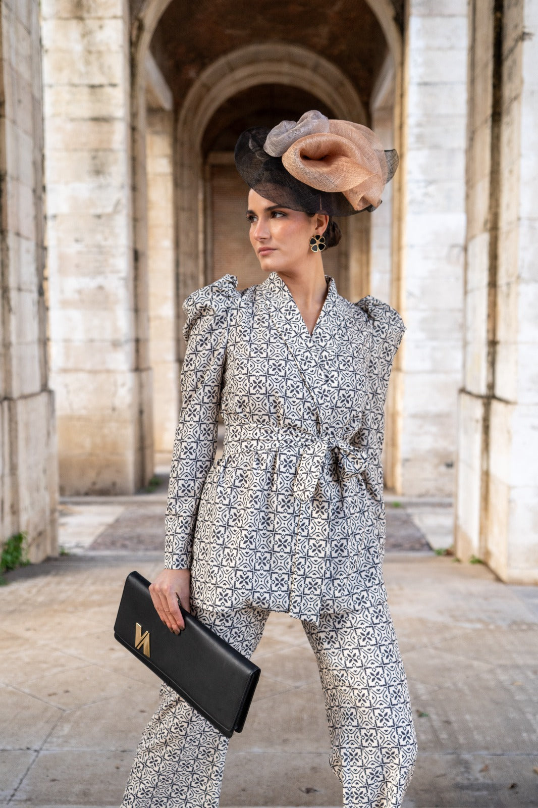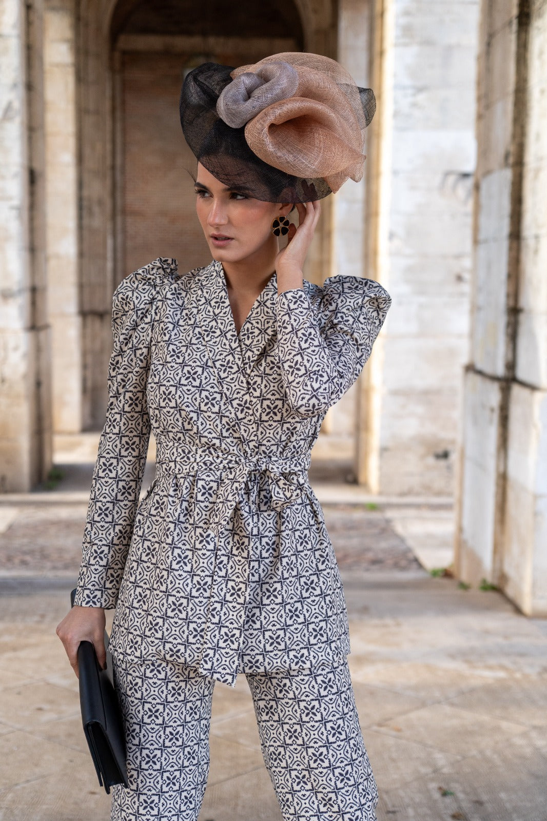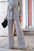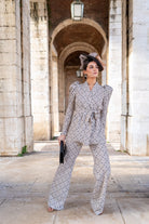 Conjunto compuesto por chaqueta cruzada con cinturón, manga larga abullonada y pantalón tiro alto ancho. En color blanco y negro estampado.