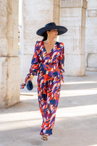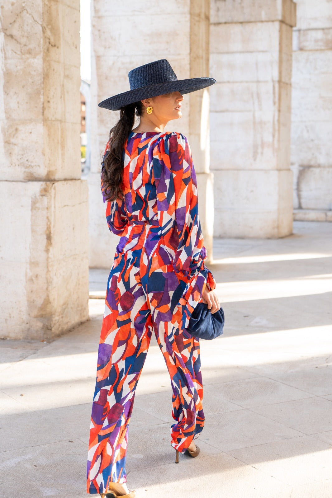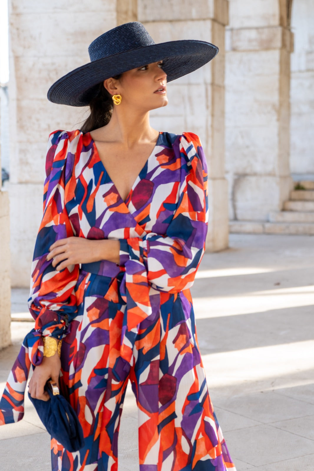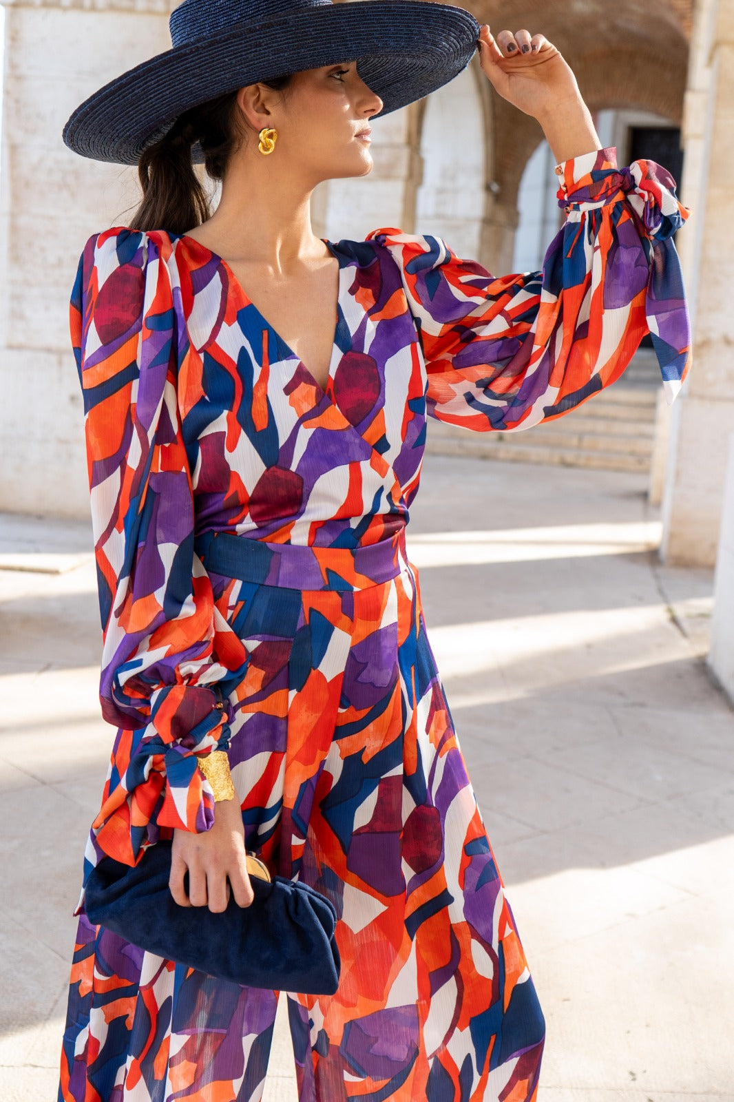 Conjunto compuesto por blusa escote cruzado manga larga con lazo en puños y pantalón tiro alto, palazzo. En colores estampado.