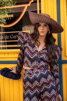 Conjunto compuesto por chaqueta manga larga, alerones en hombro, escote a pico, abrochada delante y pantalón tiro alto, estrecho. En estampado multicolor.