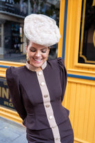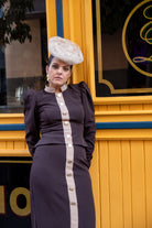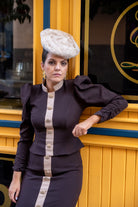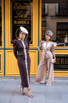 Conjunto compuesto por chaqueta, cuello subido, manga abullonada con manga fruncida, detalle botones delanteros (no se abren) y falda alta, recta con detalle botones delanteros. Bicolor marrón y beige.