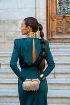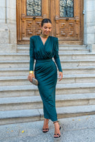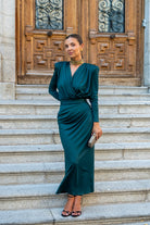 Conjunto compuesto por body escote cruzado, manga larga, hombros marcados y falda recta con cinturilla, drapeada. En color verde.