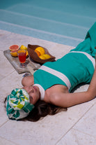Vestido al cuello, anudado detras, escote trasero, vuelo abajo. En color verde, con franja beige.