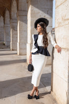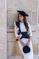 Vestido midi, escote redondo, manga francesa, volante en hombro y cintura, abertura trasera. Bicolor blanco y negro.