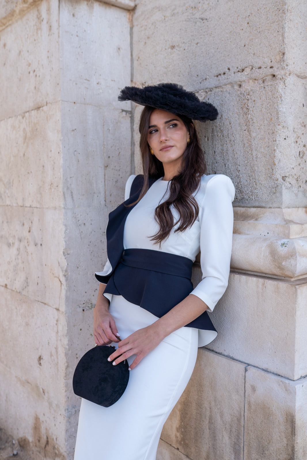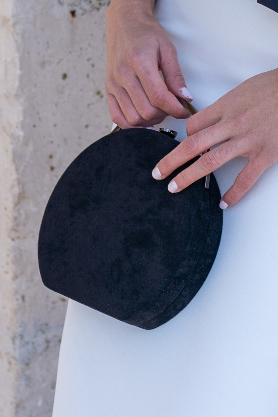 Bolso forrado en satén negro, asa rígida y cadena para colgar en color plata.