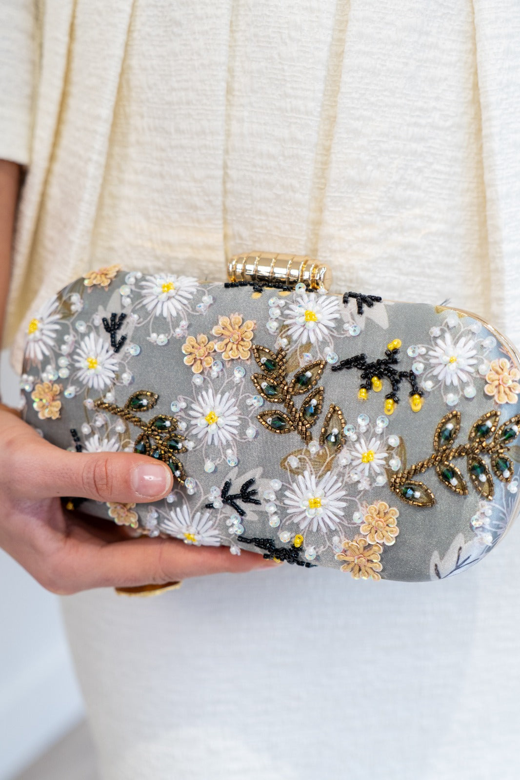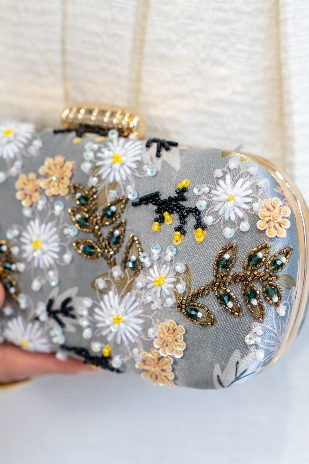 Bolso ovalado, con pomo dorado, cadena larga para colgar. Con estampados y pedrería en varios colores.