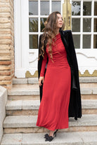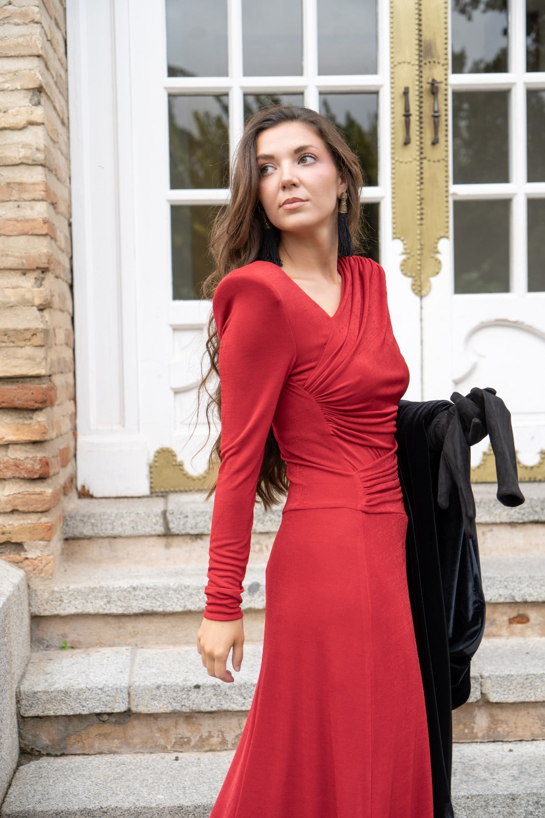 Vestido de punto con manga larga, cuerpo drapeado dejando el escote asimétrico, falda de capa. En color rojo.
