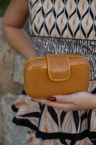Cartera ovalada, cierre con iman, cadena dorada para colgar. En color mostaza.
