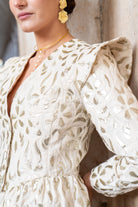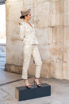 Conjunto compuesto por chaqueta entallada, escote en pico y hombros estructurados, incorpora mangas desmontables mediante cremallera invisible en la sisa, permitiendo transformar la prenda en chaleco. Pantalón corte recto, bolsillos laterales, pinzas. Bordado marfil con delicados motivos florales en relieve.