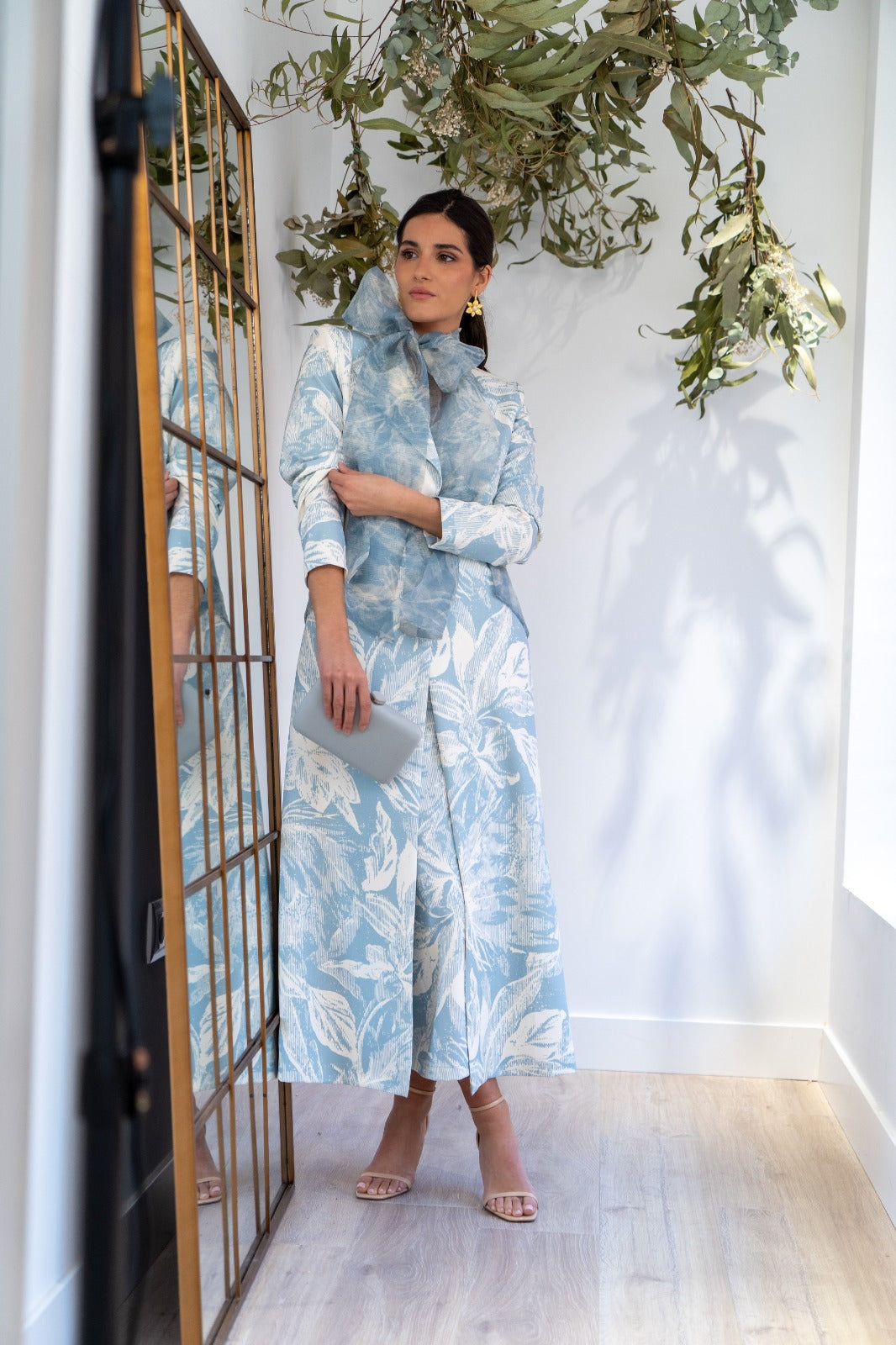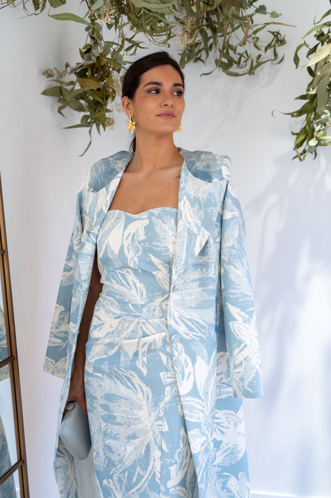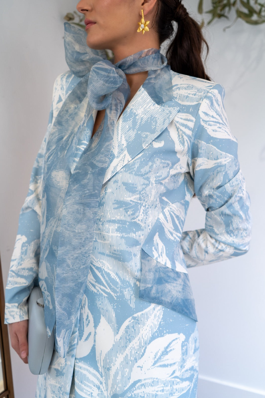 Conjunto compuesto por vestido palabra de honor, abertura trasera y abrigo cuello smokin con lazo de organza, manga francesa. En color blanco con estampado azul.