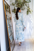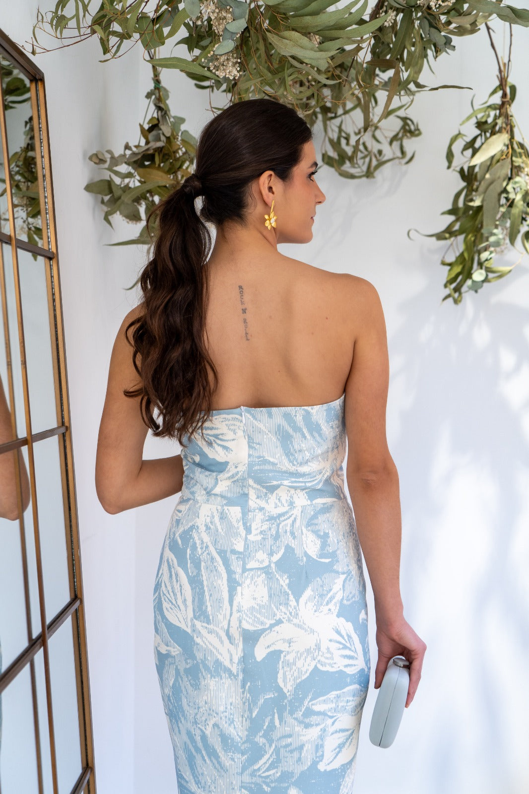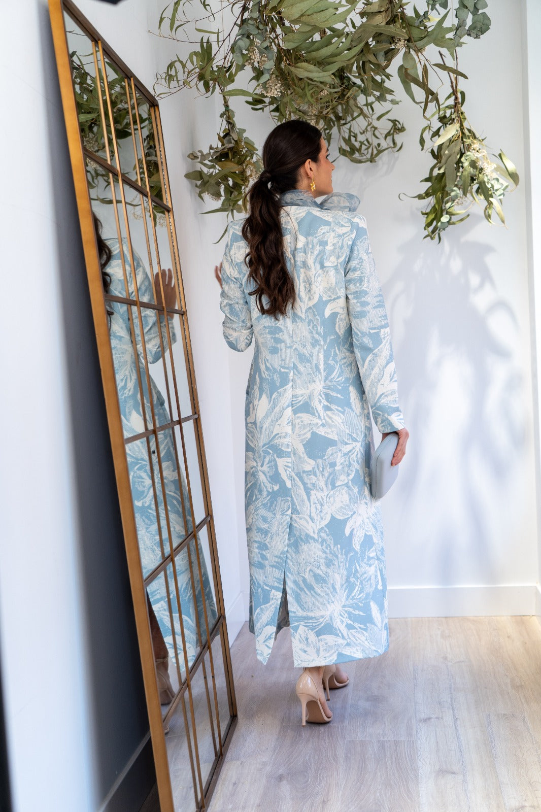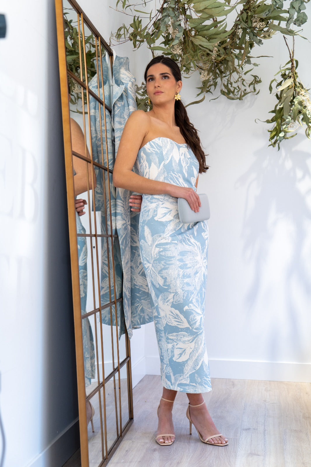 Conjunto compuesto por vestido palabra de honor, abertura trasera y abrigo cuello smokin con lazo de organza, manga francesa. En color blanco con estampado azul.
