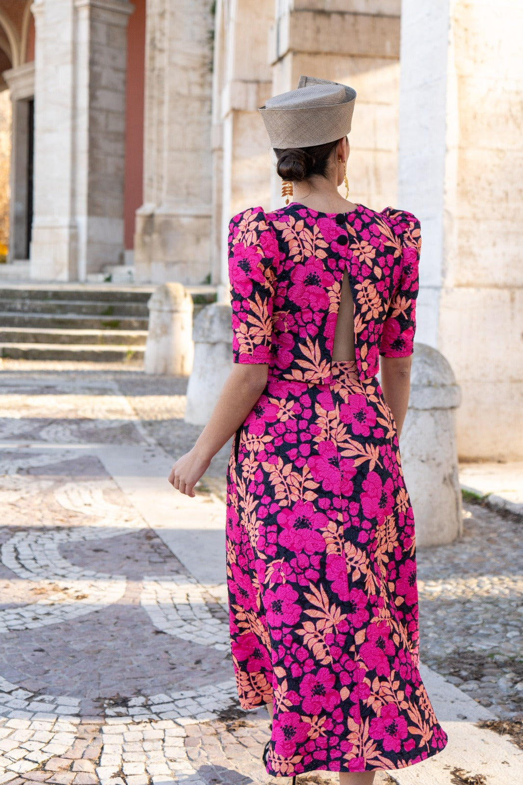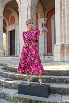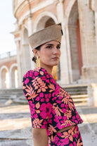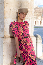 Conjunto compuesto por top, escote redondo, manga corta abullonada y falda corte evase, bolsillos laterales. En jaguar estampado multicolor.
