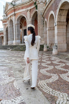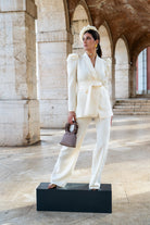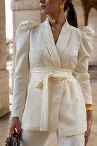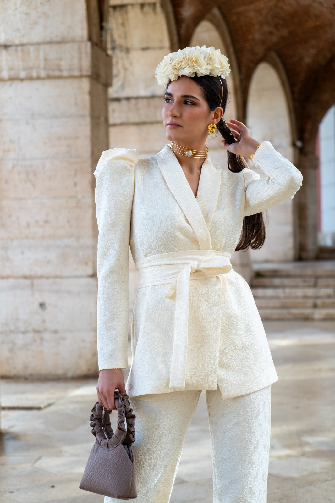 Conjunto compuesto por chaqueta cruzada, manga larga abullonada y pantalón tiro alto recto. En color beige con brocado.