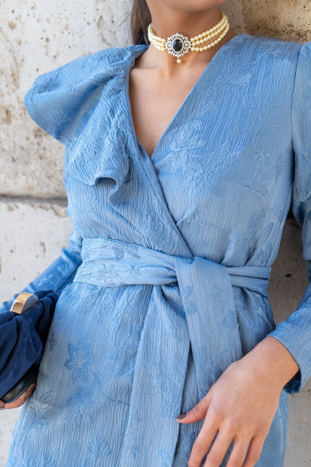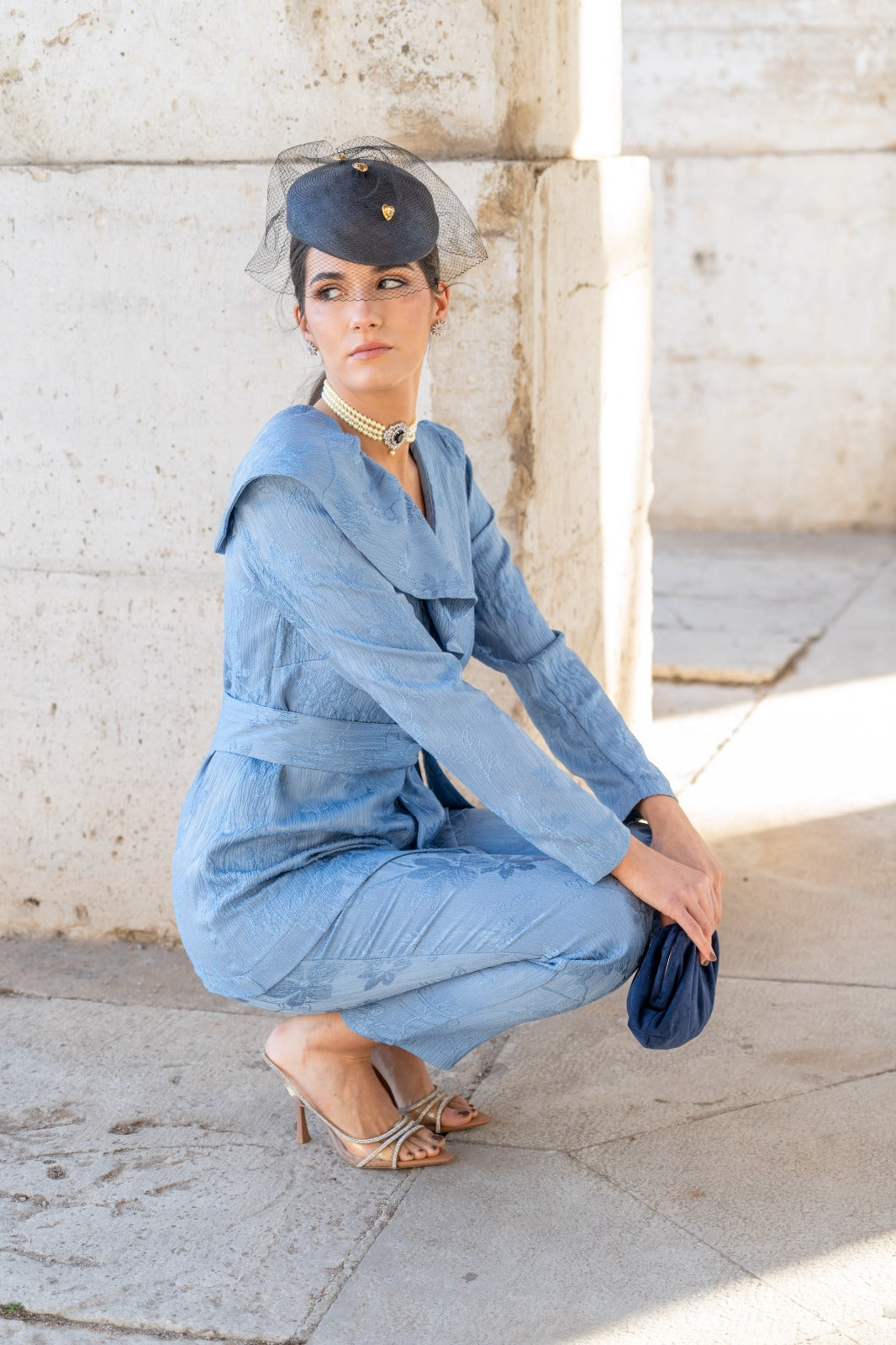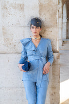 Conjunto compuesto por chaqueta cruzada con cinturón y volante en un lado, manga larga y pantalón tiro alto estrecho. En color azul con brocado.