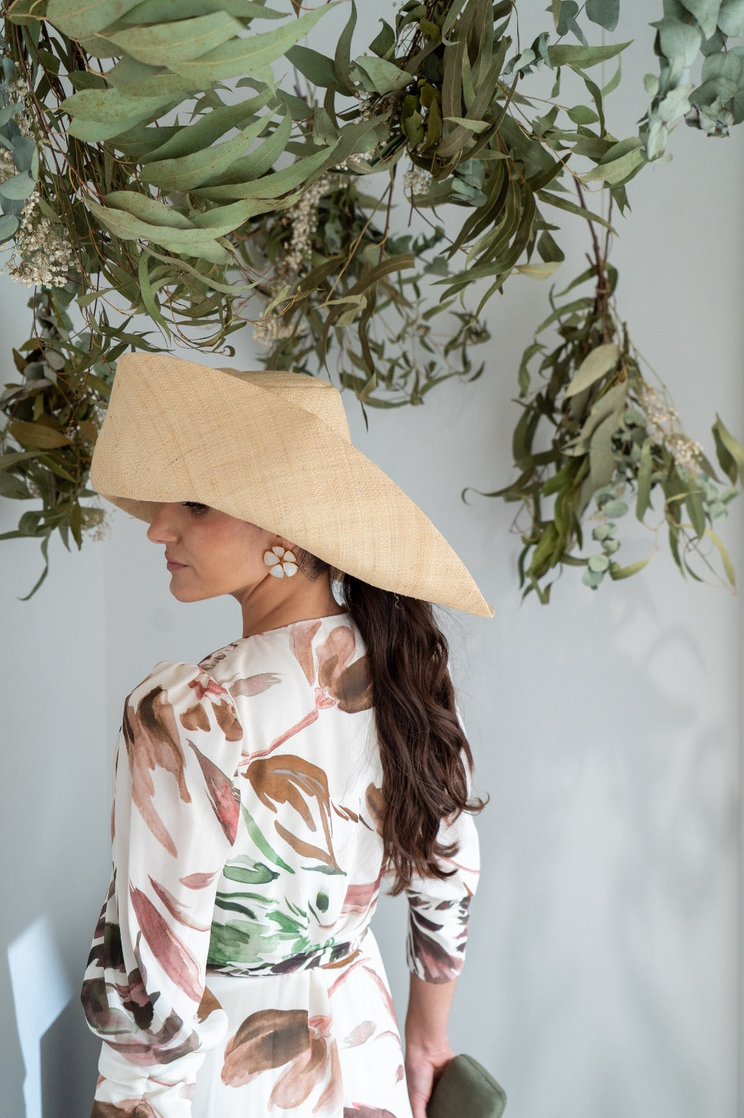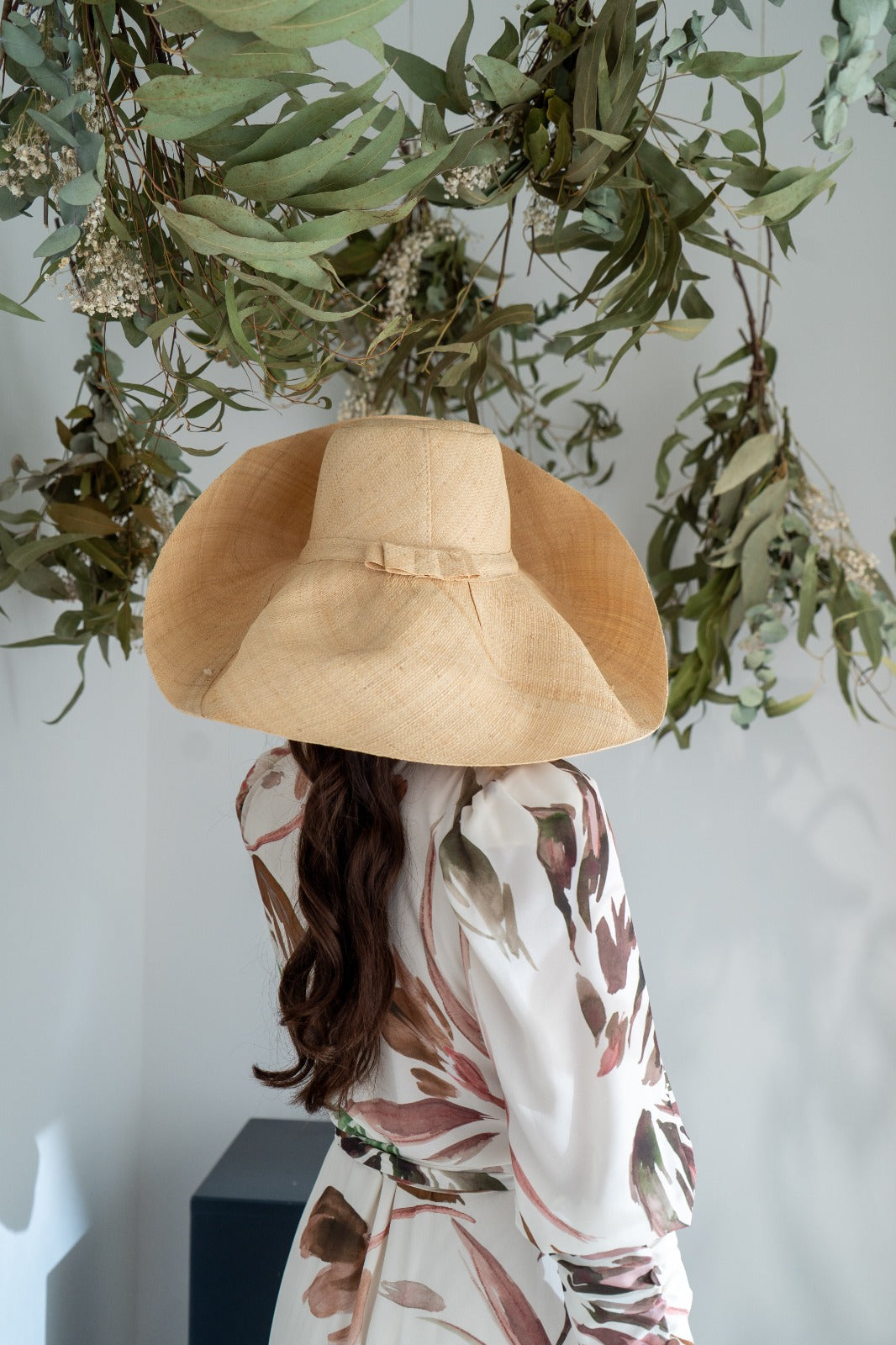 Pamela de fibra natural, teñida a mano de forma artesanal, en color natural, sin diadema.