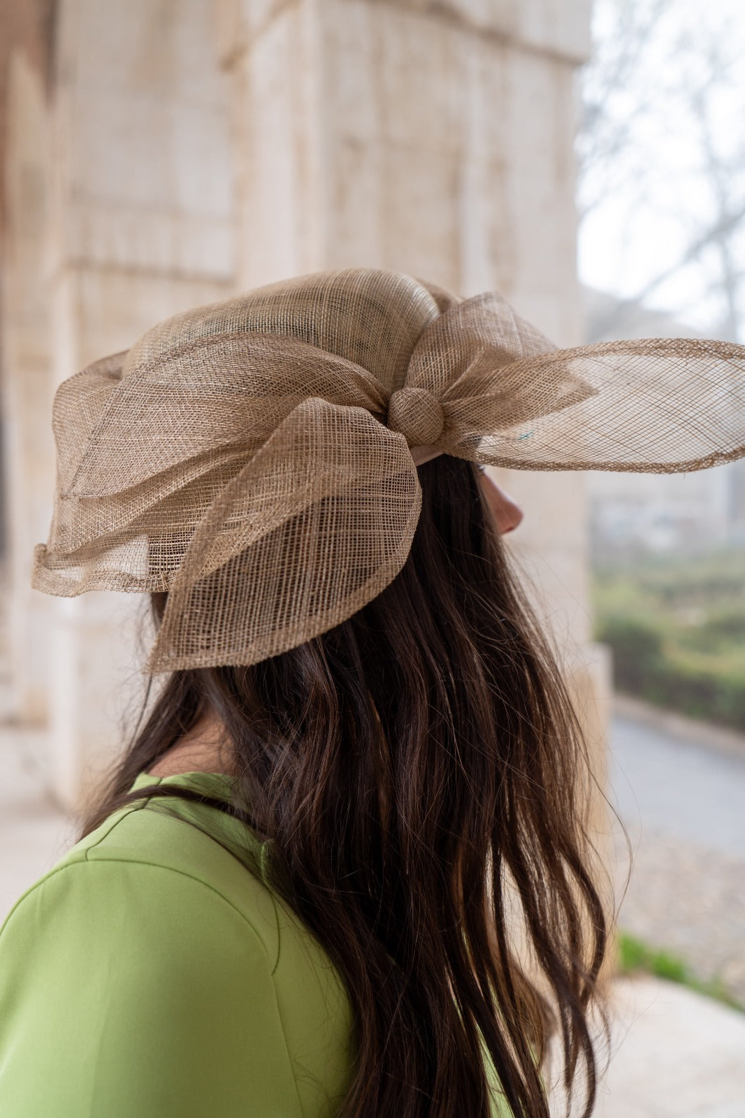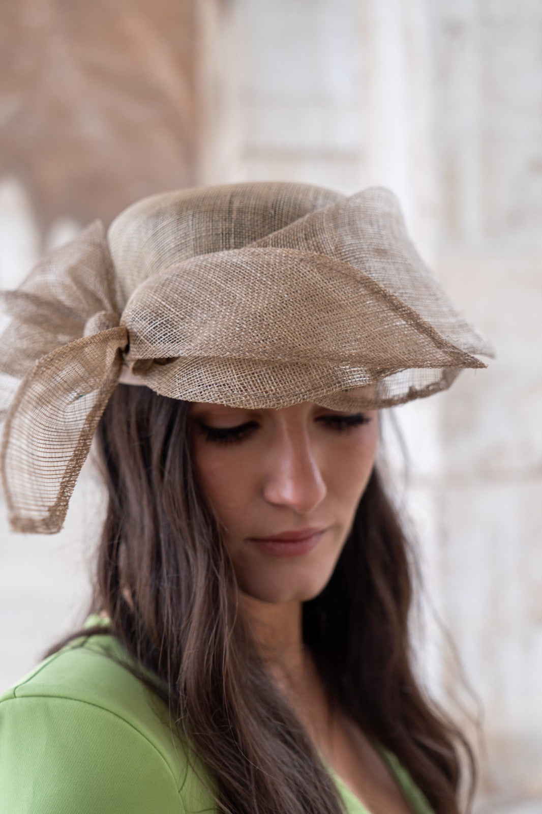 Sombrero en sinamay marrón claro, con detalle lazo en un lado.