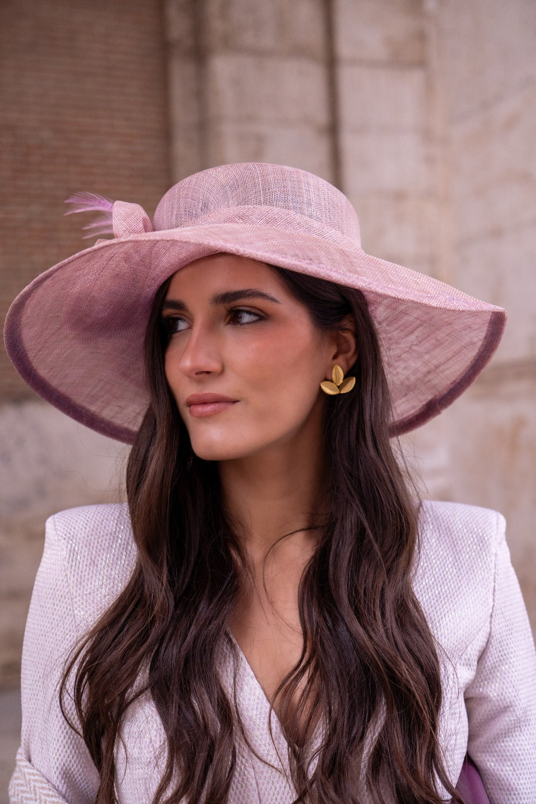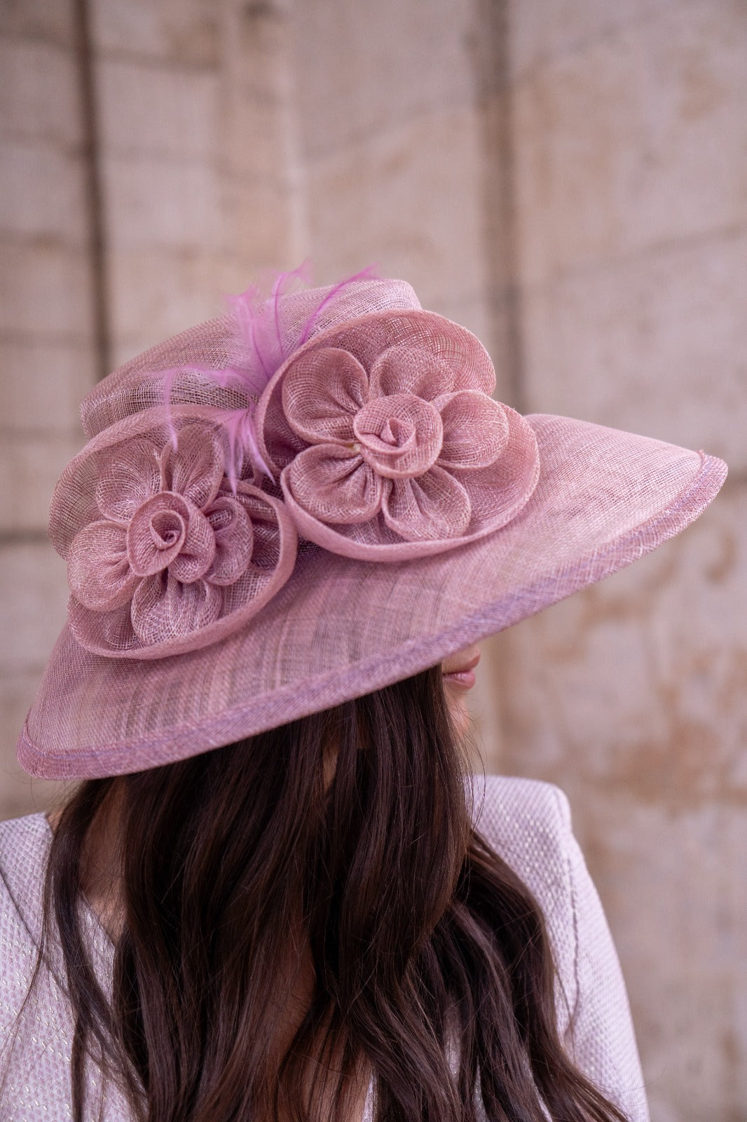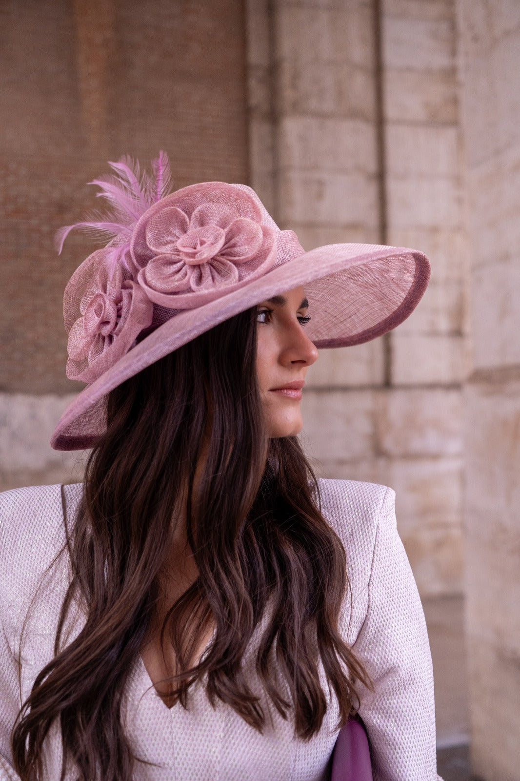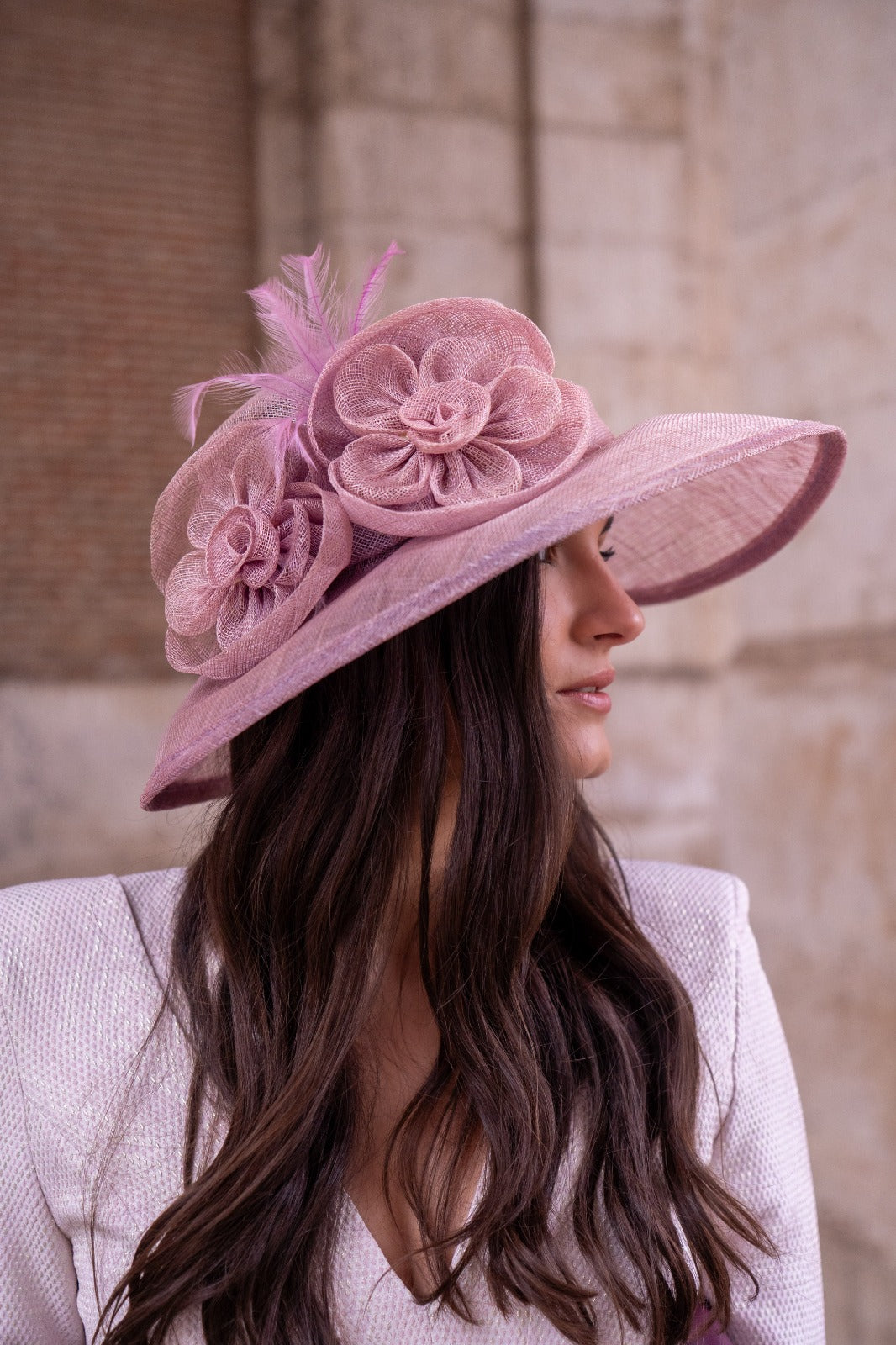 Sombrero en sinamay rosa, detalla flores en un lado.