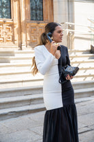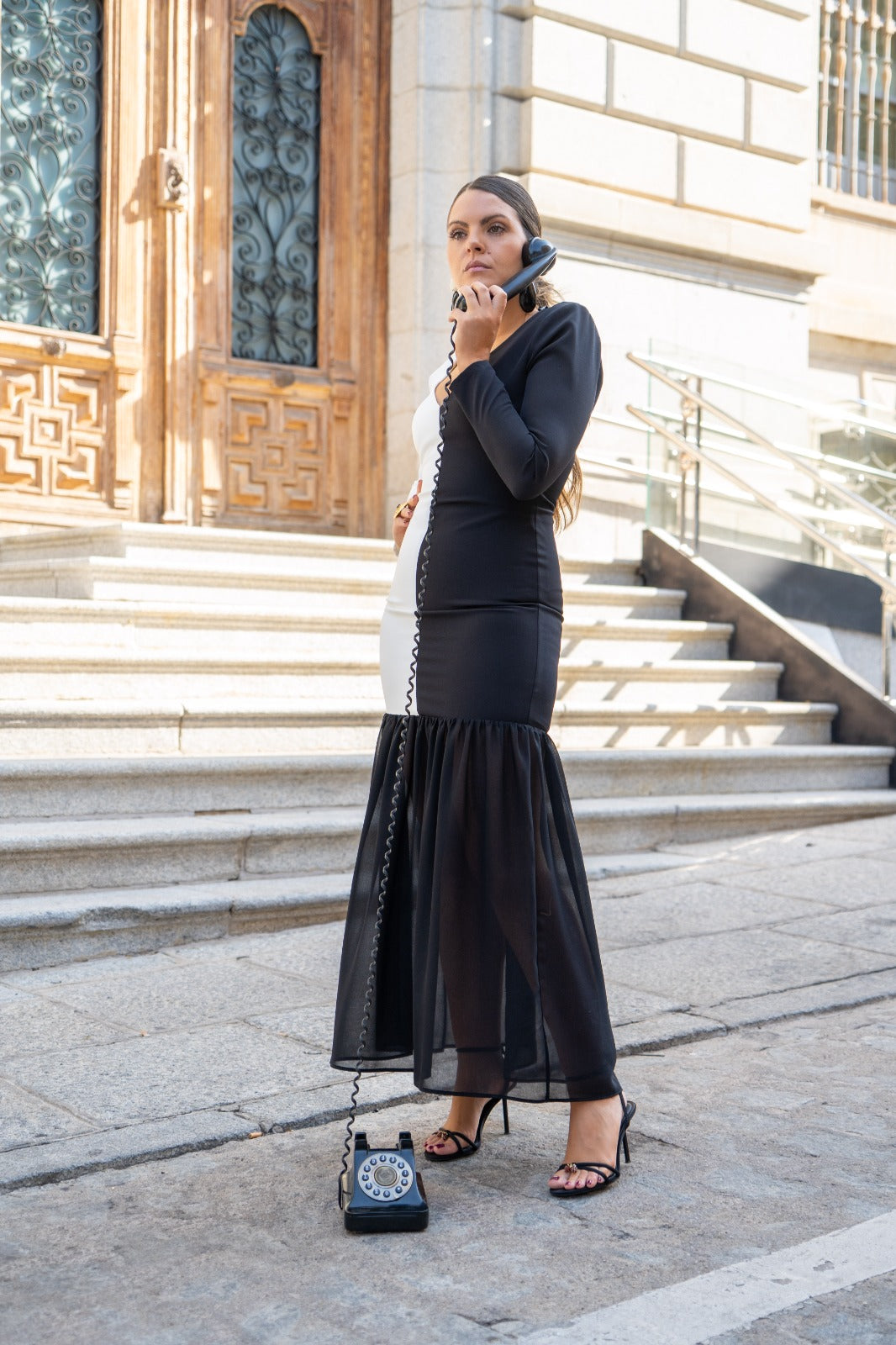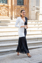 Vestido maxi midi, escote a pico, manga larga, corte abajo terminado en volante. Bicolor negro y blanco.