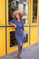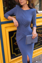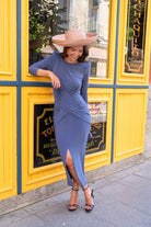 Vestido midi en punto seda, escote redondo, manga larga, frunce y abertura delantera. En color azul.
