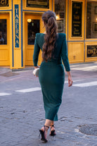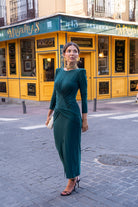 Vestido midi en punto seda, escote redondo, manga larga, frunce y abertura delantera. En color verde.