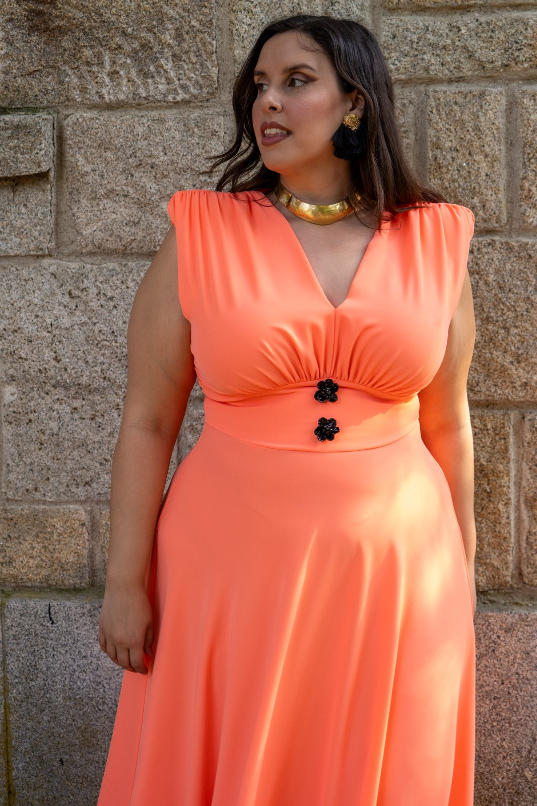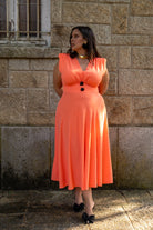 Vestido midi, escote a pico, sin mangas, hombrera alta, corte en cintura con detalla botones, vuelo abajo. En color naranja.