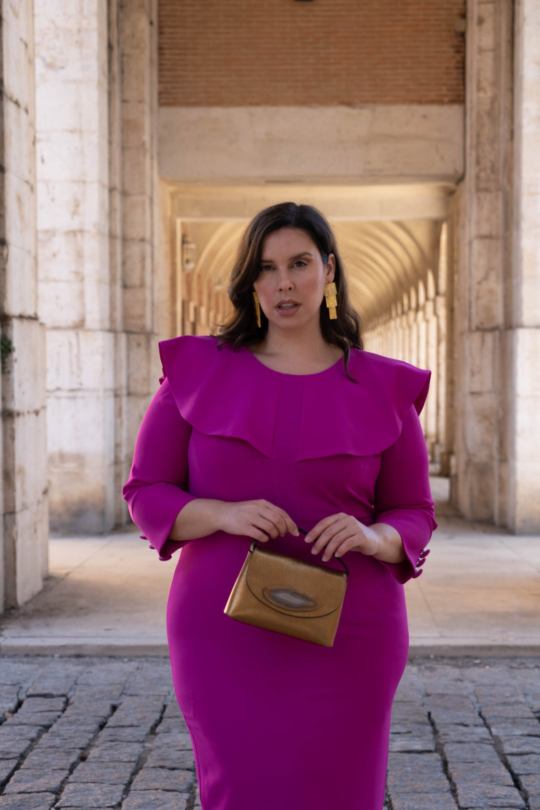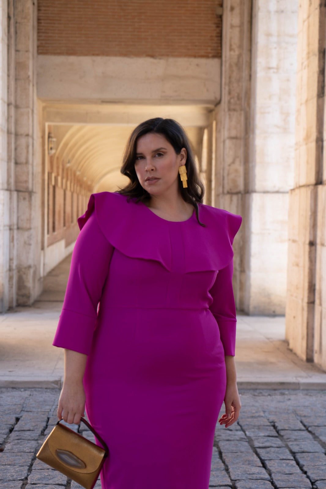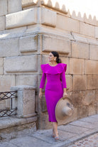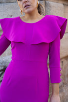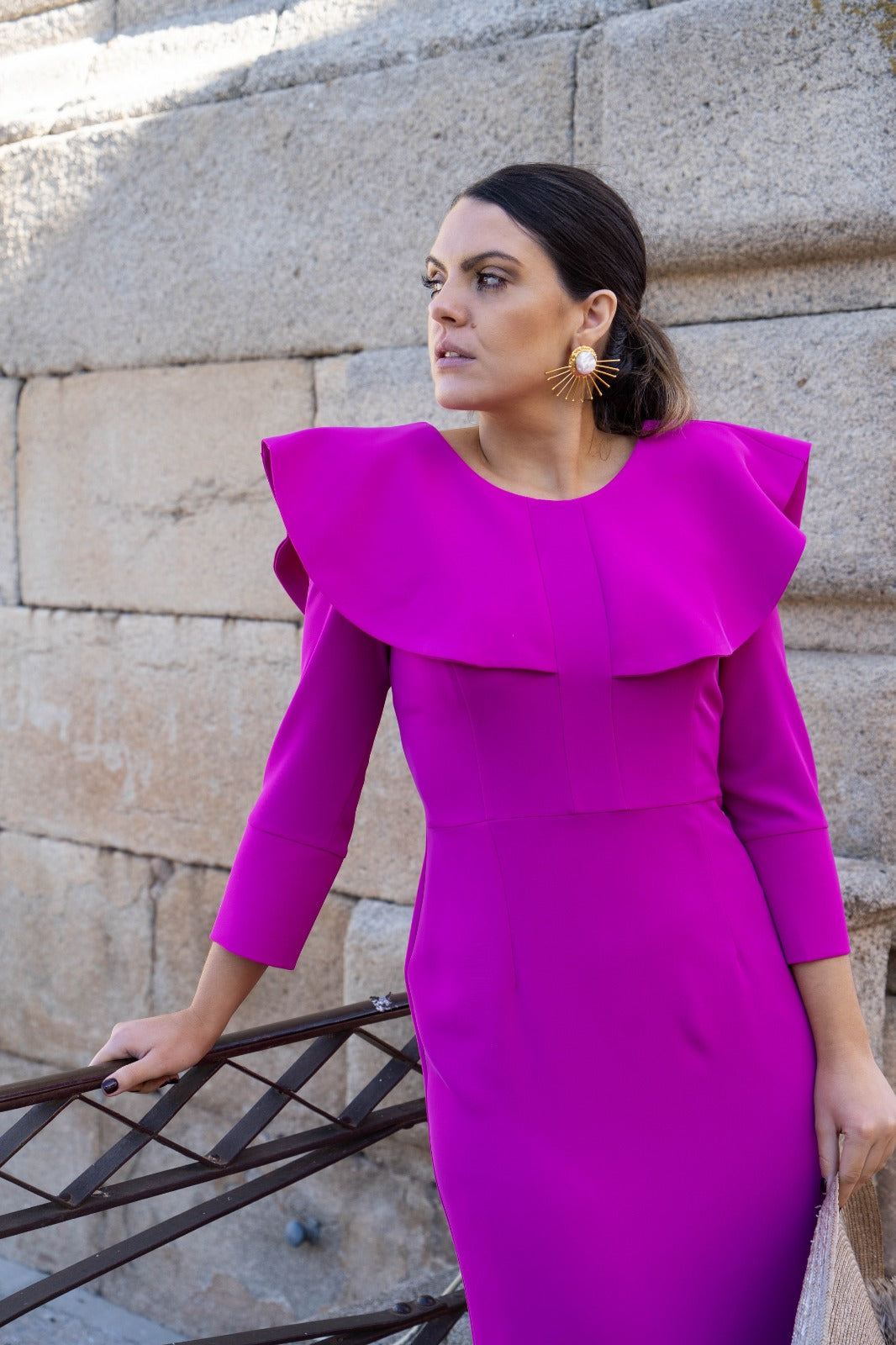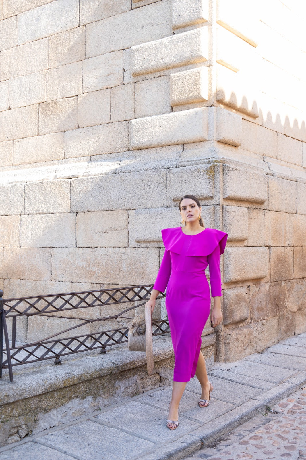 Vestido midi, escote redondo con volante encima, manga francesa con puño y botones, corte en cintura, abertura trasera. En color rosa.