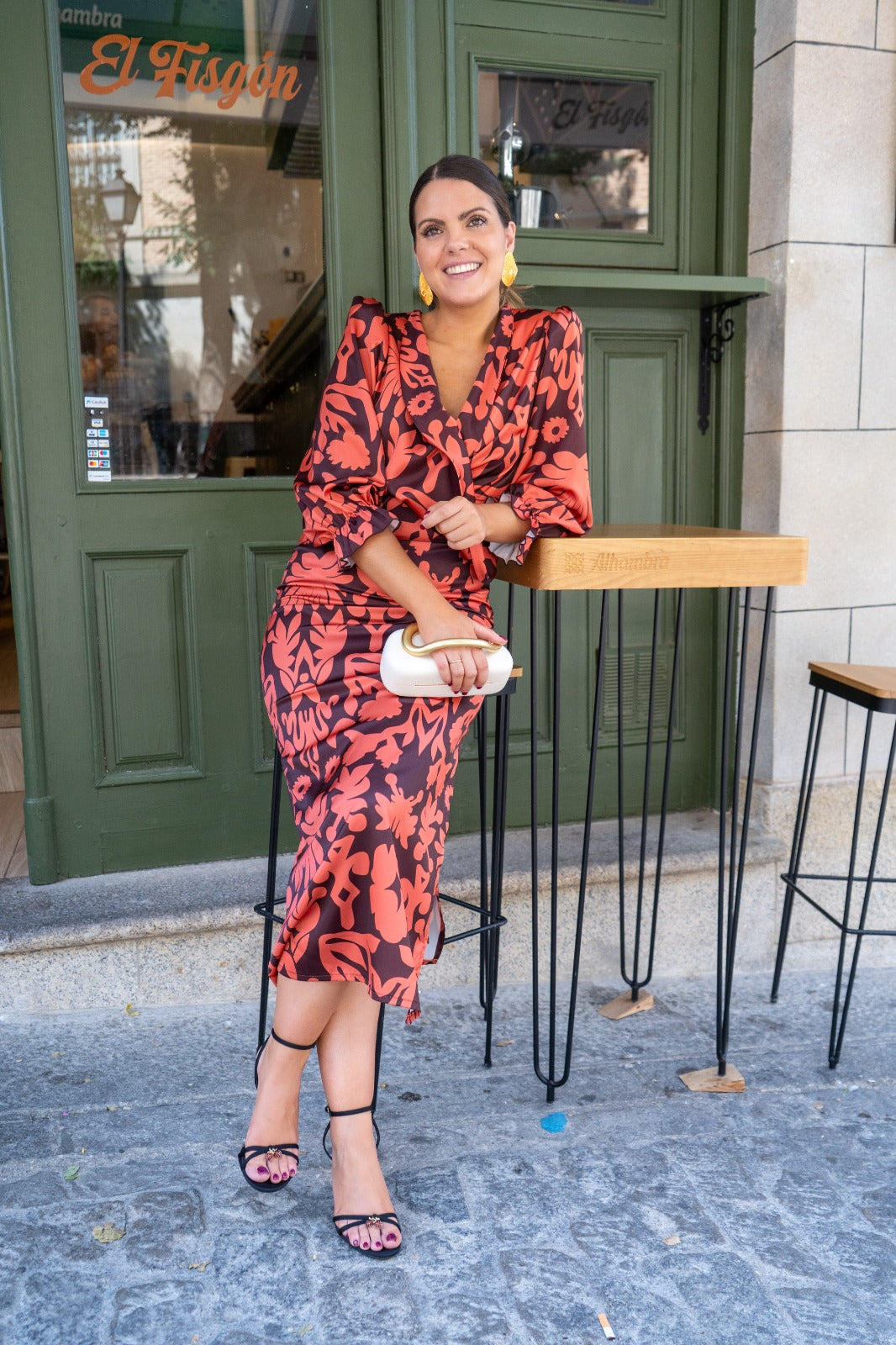 Vestido midi, escote cruzado, manga francesa con goma en puño, abertura delantera a un lado. Estampado marrón y teja.