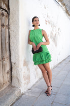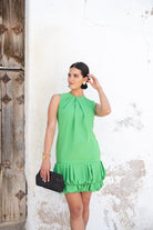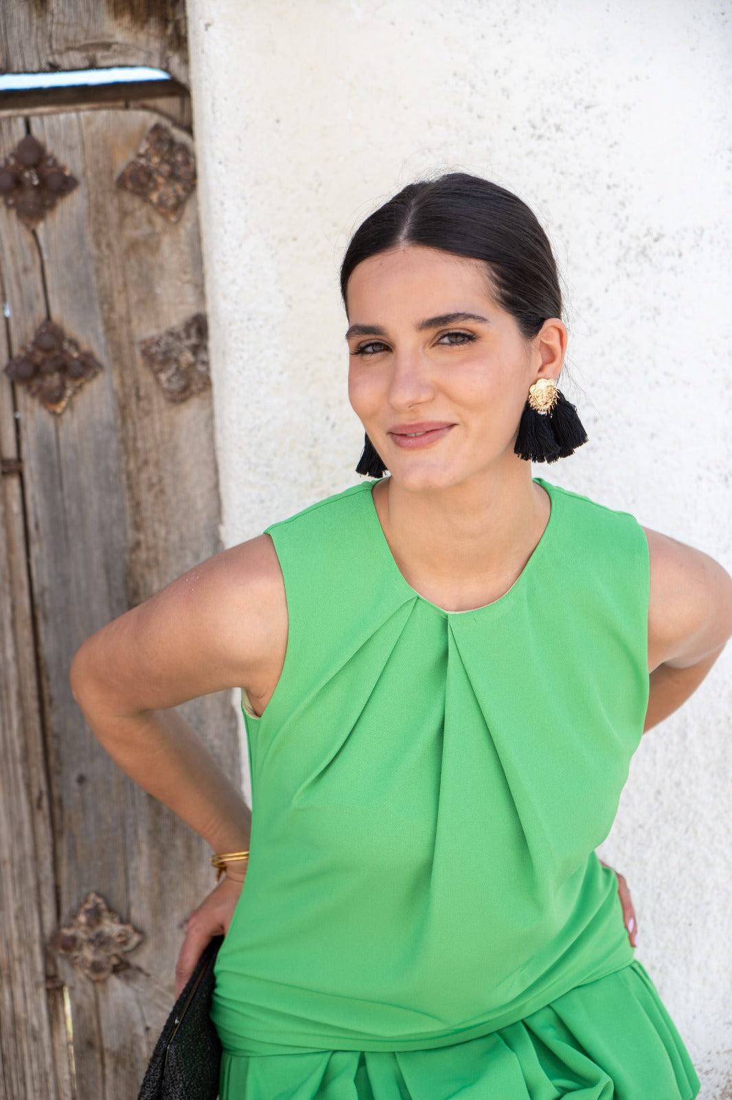 Vestido corto, escote redondo plisado, sin mangas, falda globo. En color verde.