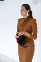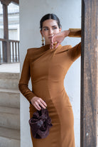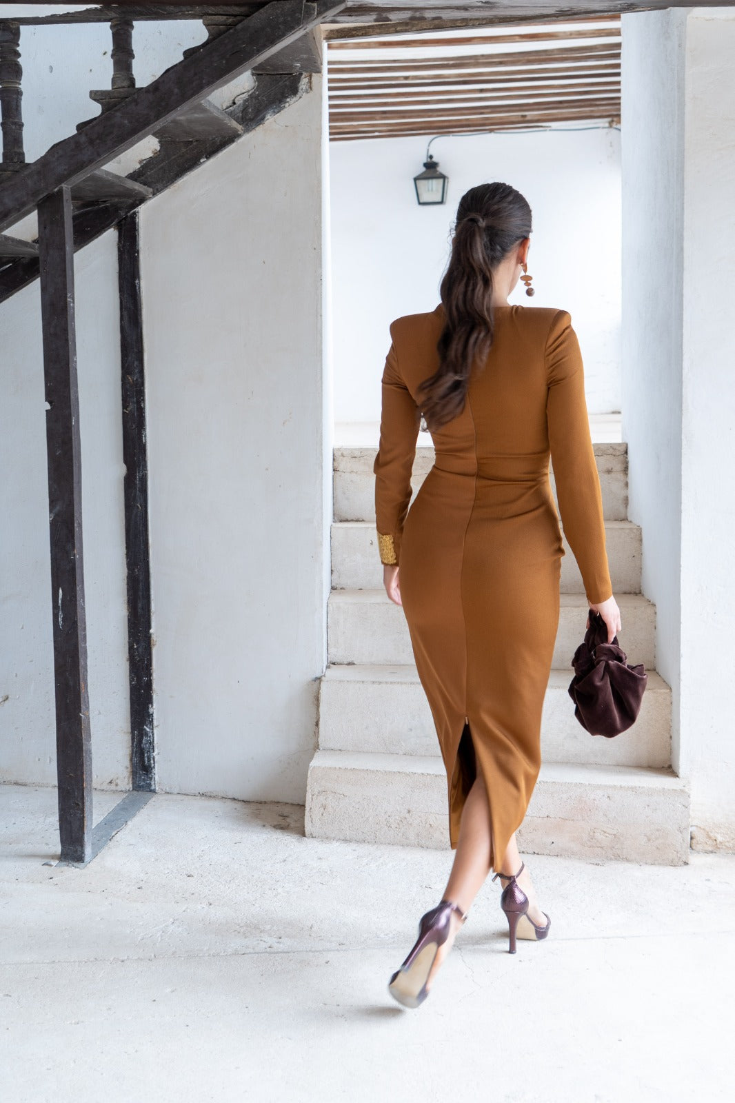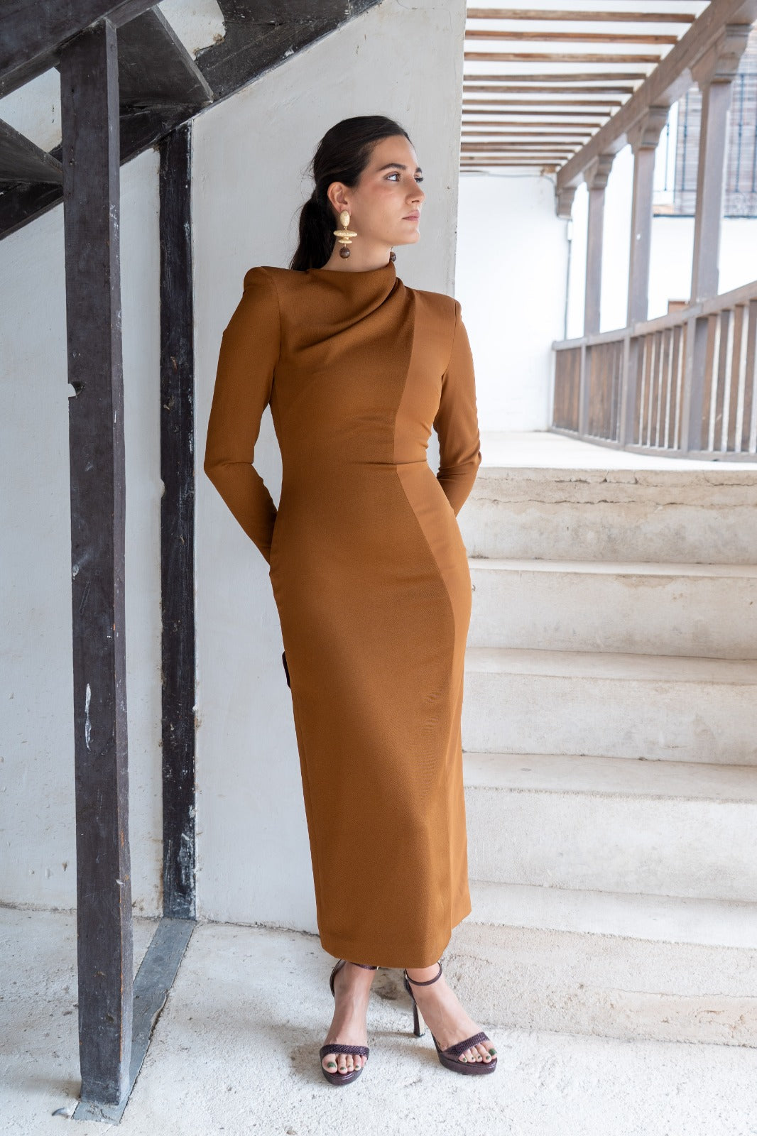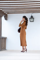 Vestido midi, escote drapeado que envuelve el cuello, manga francesa, abertura trasera. Combinación de tejidos en color marrón.