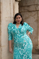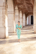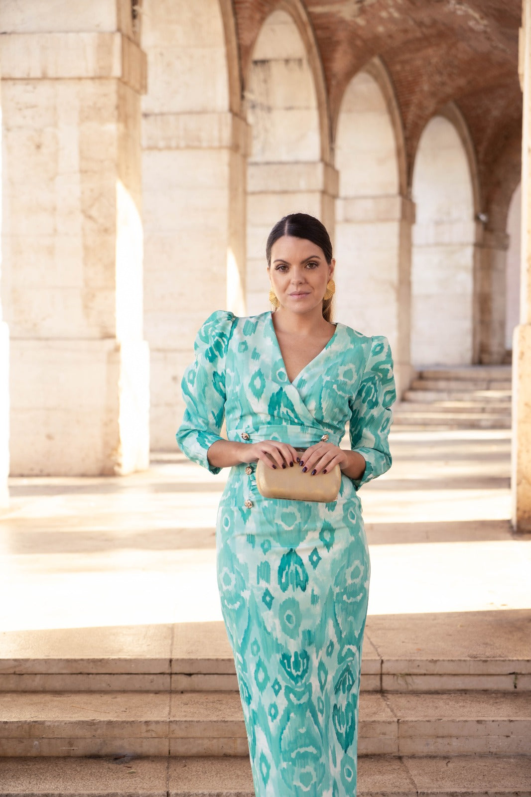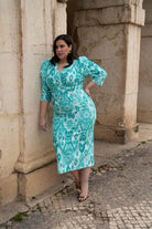 Vestido midi, escote cruzado, manga francesa, fruncido delantero y detalla botones dorados, abertura trasera. En color verde con estampado.
