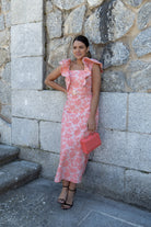 Vestido midi, escote cuadrado y volantes estructurados en los hombros. En color coral con estampado flora en relieve.