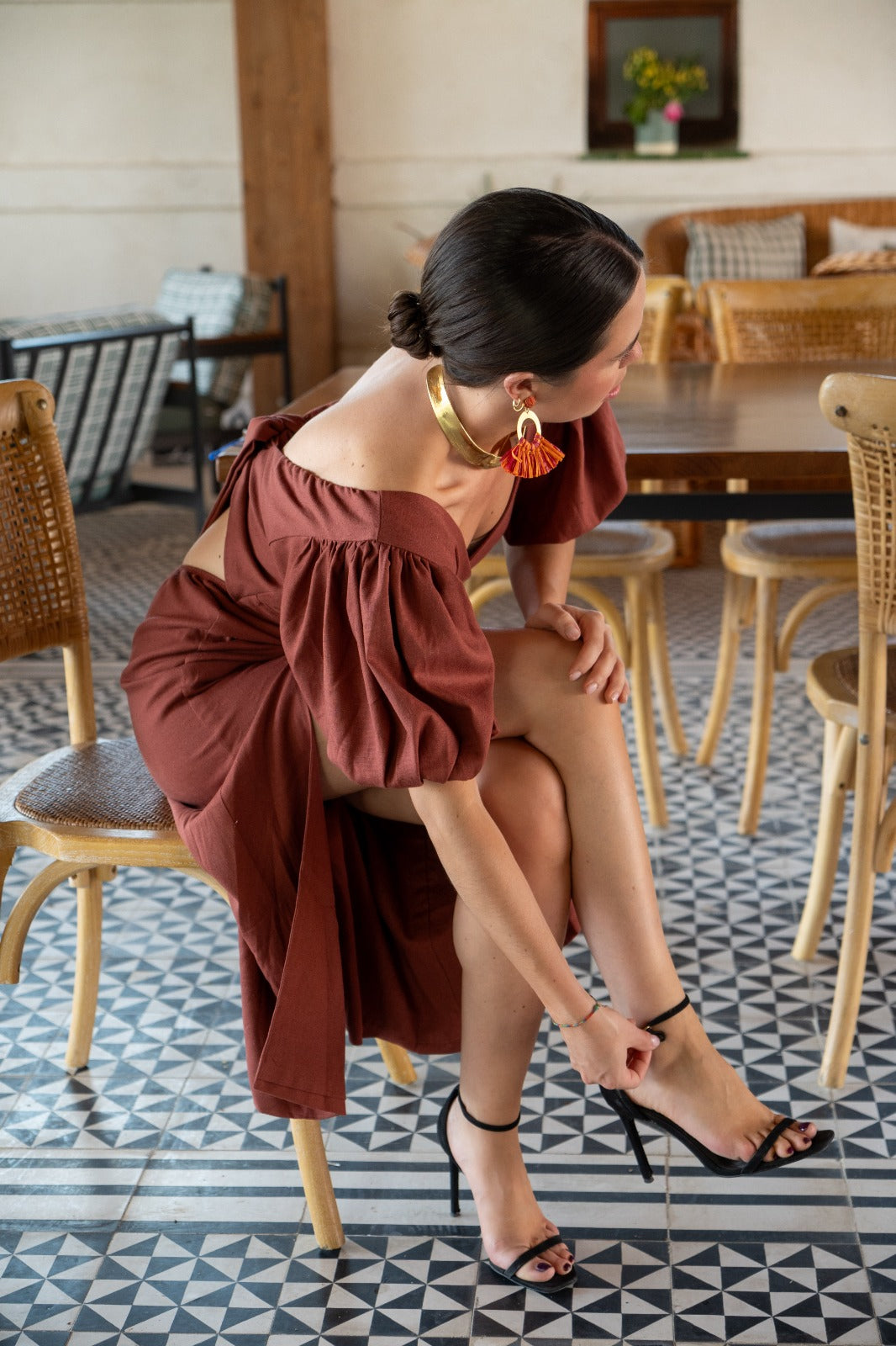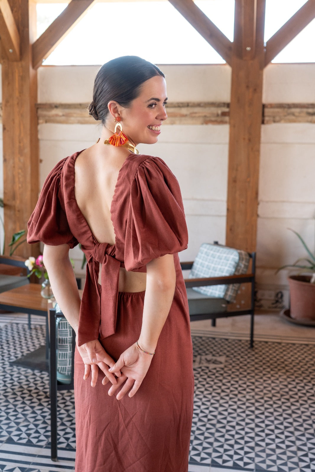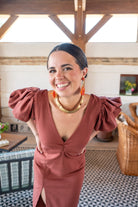Vestido largo, escote a pico, manga corta abullonadas, anudado en la espalda abertura delantera a un lado. En color marron.