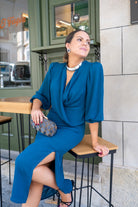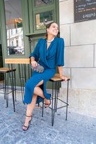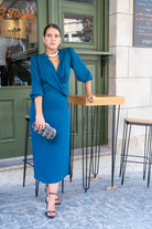 Vestido midi, escote cruzado, manga francesa con goma en puño, abertura delantera a un lado. En color azul pato.