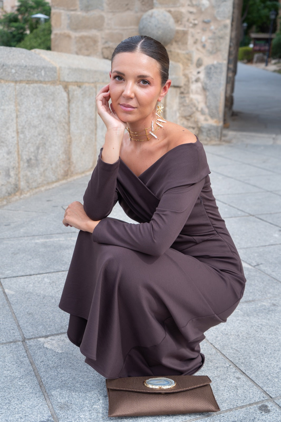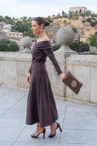 Vestido midi, escote bardot cruzado, manga larga, falda corte evase con vuelo. En color chocolate.