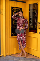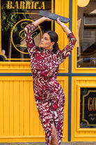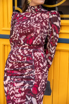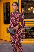 Vestido en gasa, manga larga, cuello redondo, abertura delantera a un lado con frunce, lazo para anudar. En estampado burdeos y beige.