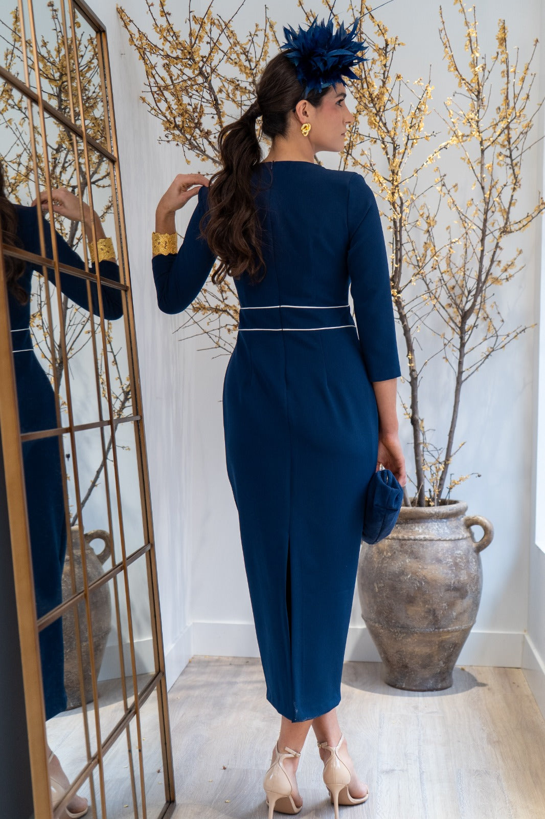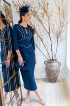 Vestido midi, escote redondo, con lagrima en el centro, manga francesa, abertura trasera. En color marino con detalle en color blanco.